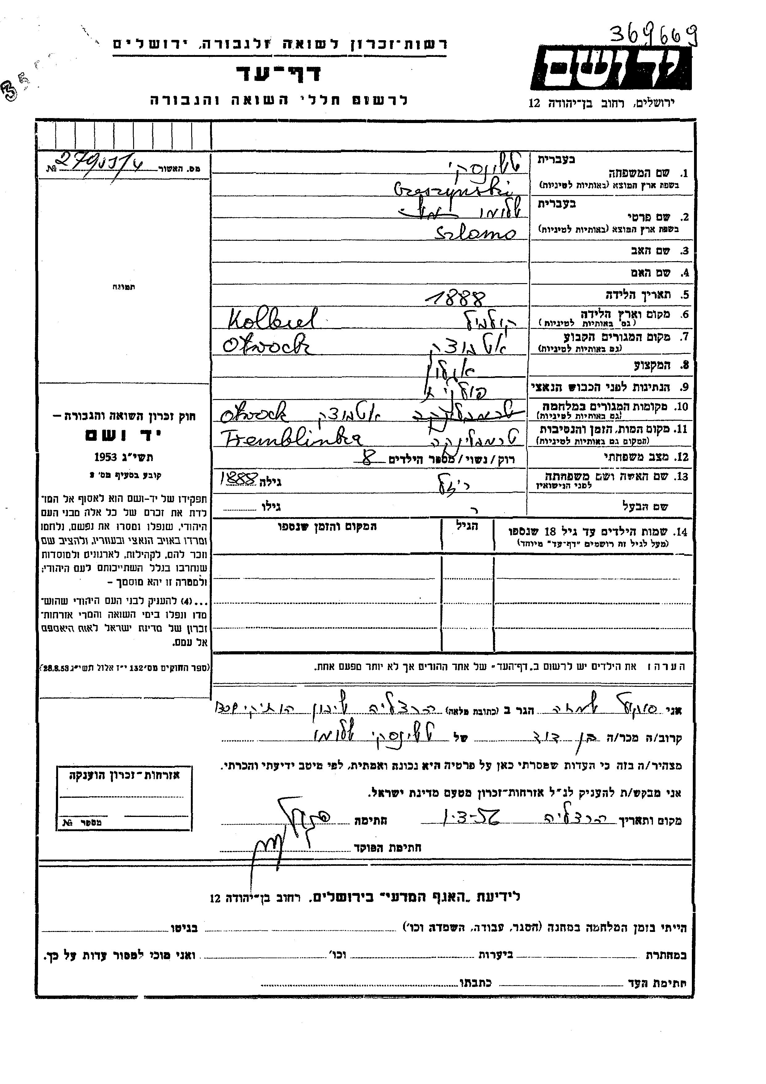 Szlomo Czeszynski Tashinski was born in Kolbiel, Poland, 1888. He was a waggoner and married to Reizel. Prior to WWII he lived in Otwock, Poland. During the war he was in Otwock, Poland. Szlomo was murdered in the Shoah. Place of death: Treblinka I, Poland.