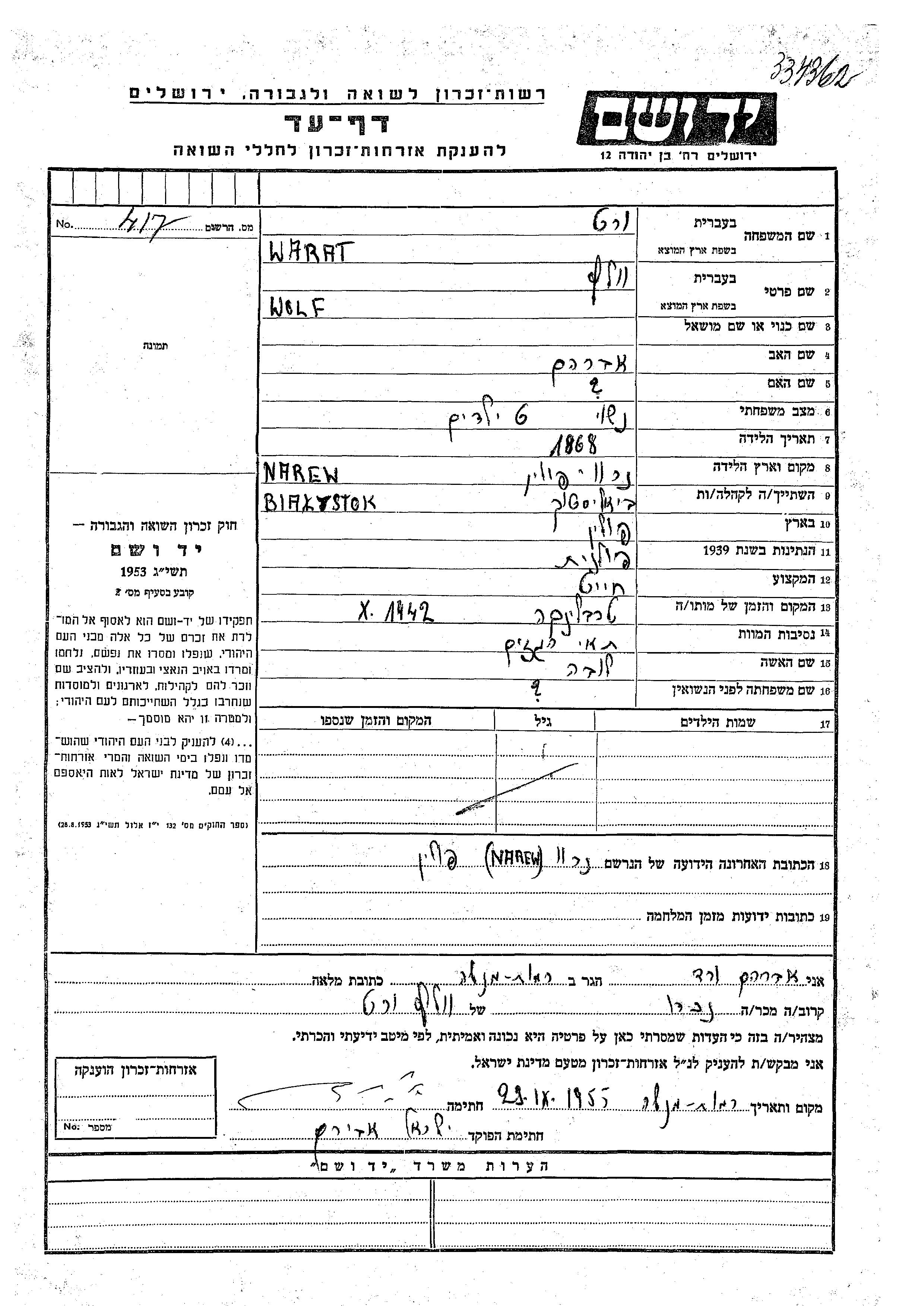 Wolf was murdered in the Shoah. Place of death: Treblinka, Poland, 1942.