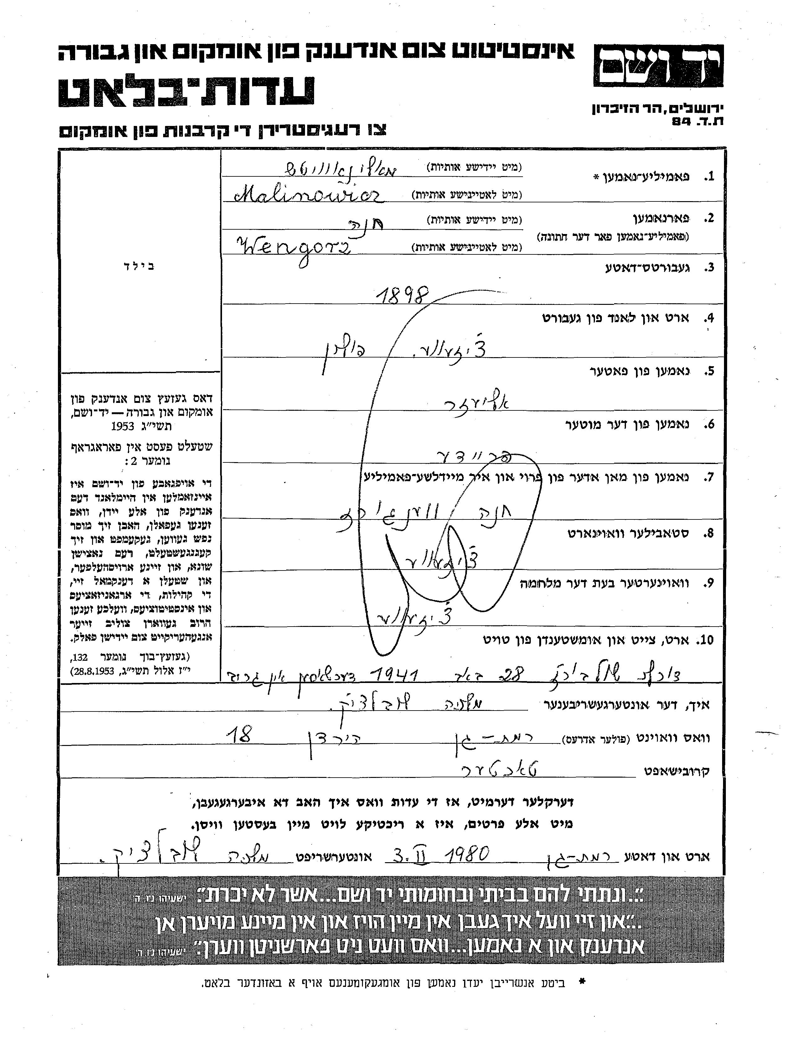 Khana Malinowicz nee Wengorz was born in Czyzew, Poland, 1898 to Eliezer and Freide. Prior to WWII she lived in Czyzew, Poland. During the war she was in Czyzew, Poland. Khana was murdered in the Shoah. Place of death: Szulborze, Poland, 1941.