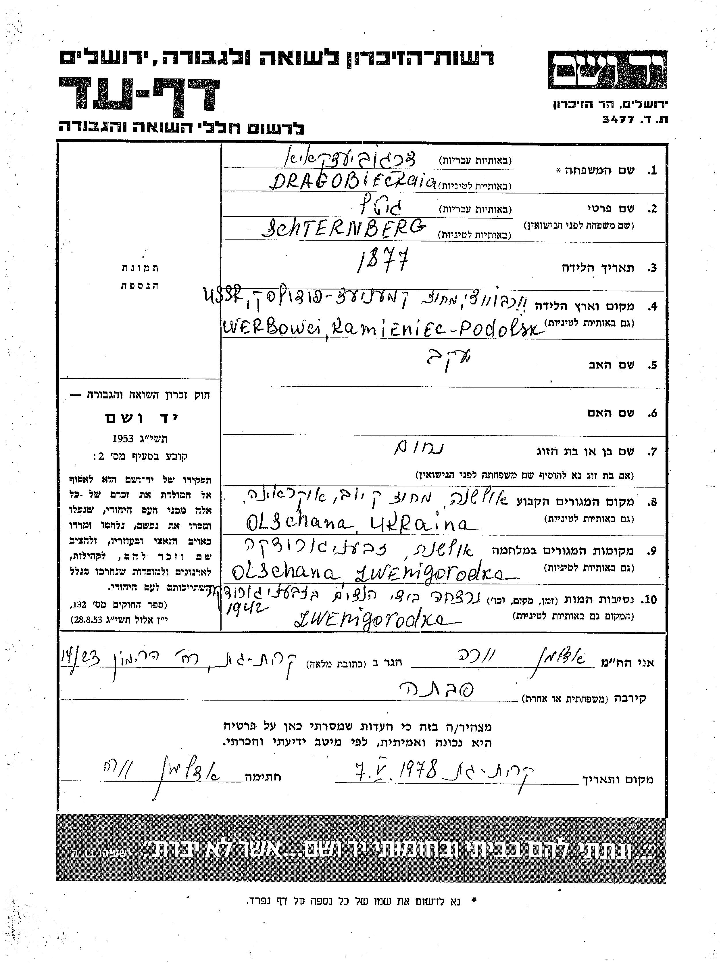 Gitel Dragobiecki nee Schternberg was born in Kamieniec Podolski, Ukraine (USSR), 1877 to Yaakov. She was married to Nakhum. Prior to WWII she lived in Olshana, Ukraine (USSR). During the war she was in Olshana, Ukraine (USSR). Gitel was murdered in the Shoah. Place of death: Olshana, Ukraine (USSR), 1942.