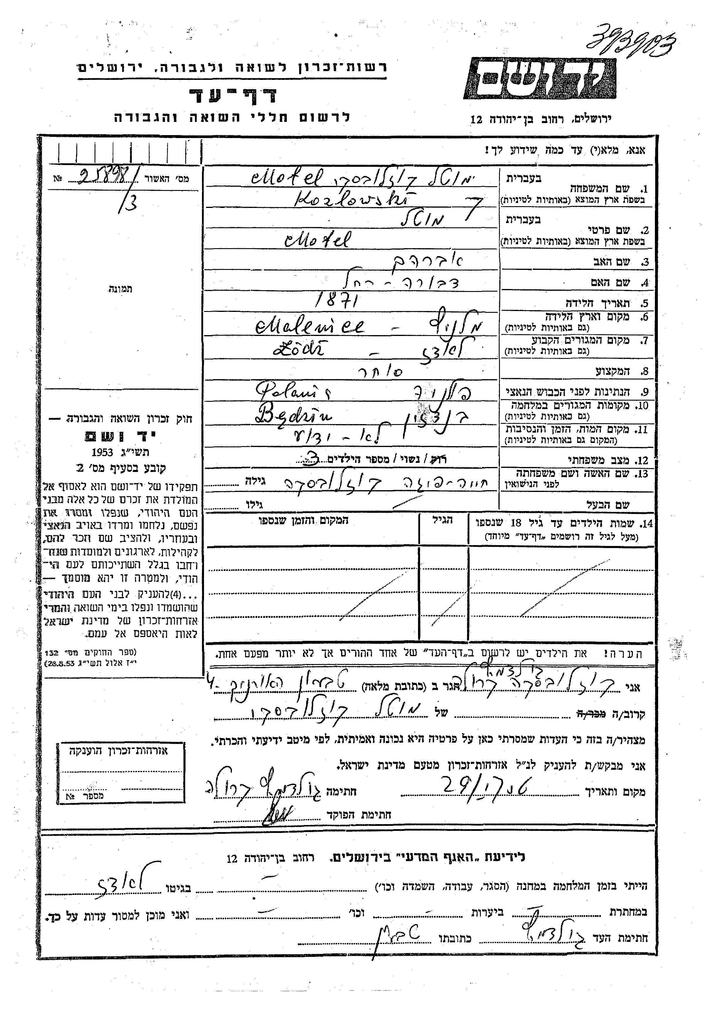 Motel Kozlowski was born in Maleniec, Poland, 1871 to Avraham and Dvora Rakhel. He was a merchant and married to Khaia. Prior to WWII he lived in Lodz, Poland. During the war he was in Będzin, Poland. Motel was murdered in the Shoah.