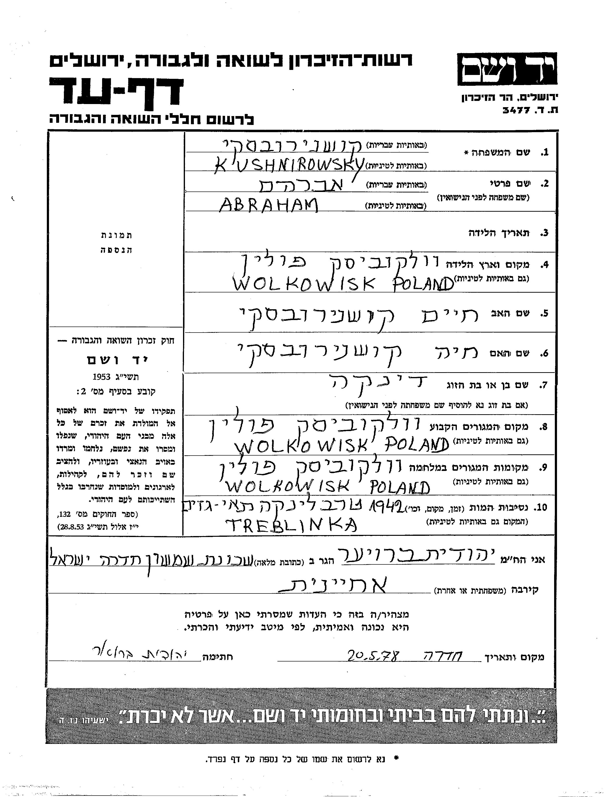 Kushnirowsky Abraham Wolkowisk, Poland Page of Testimony