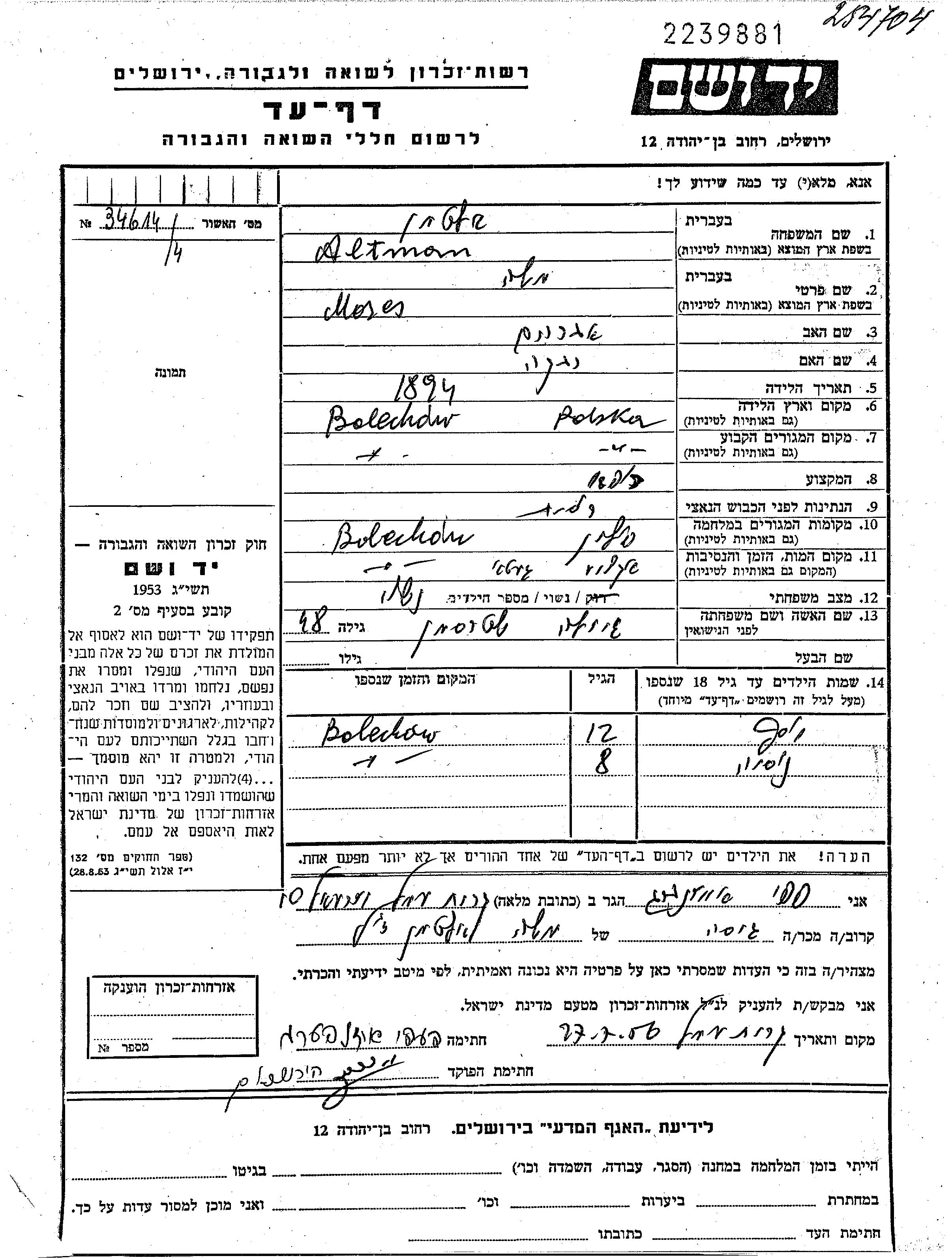 Altman Nusia Bolechow, Poland Page of Testimony