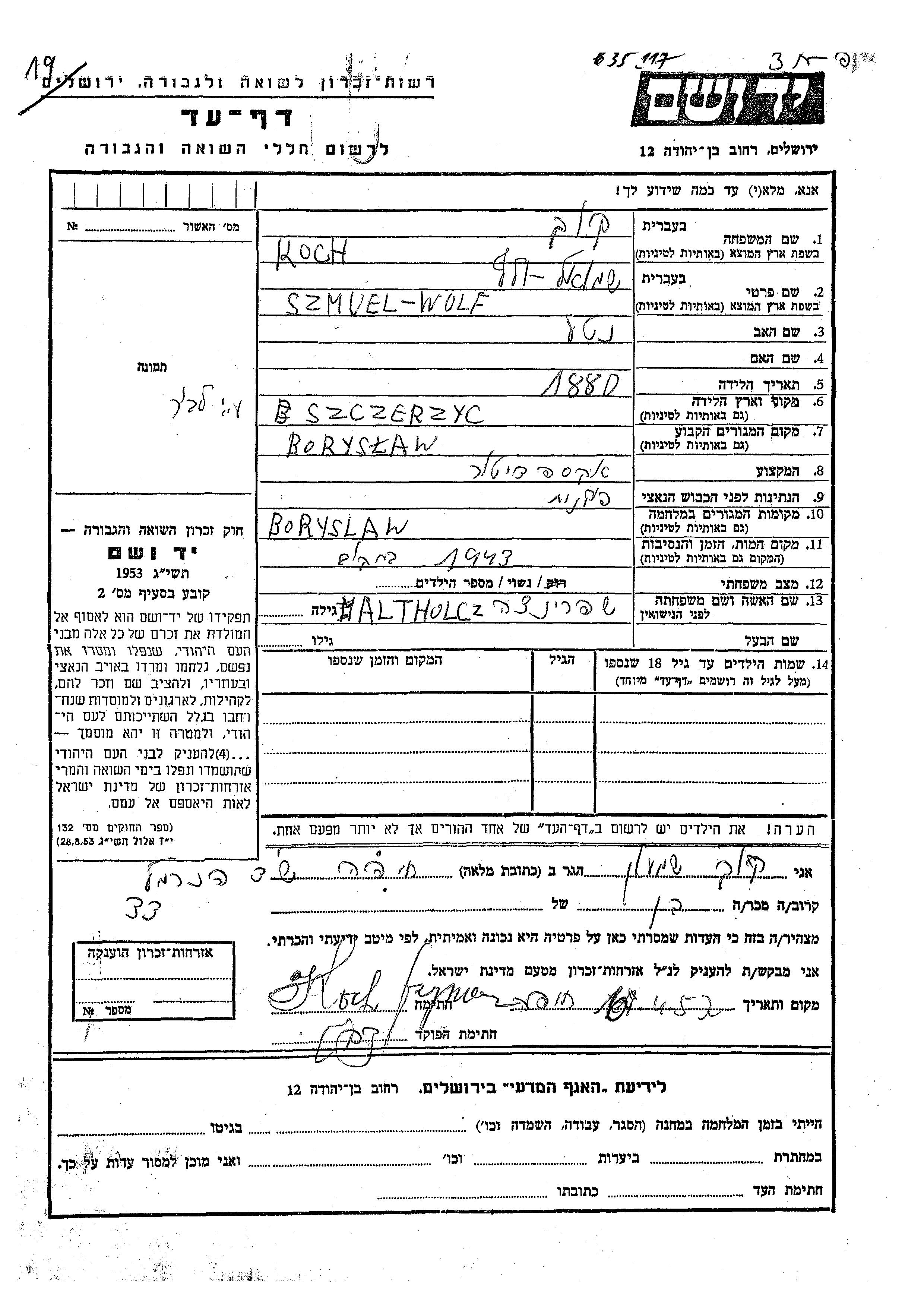 Szmuel Wolf Koch was born in Szczercow, Poland, 1880 to Nute. He was a forwarder and married to Shprintza nee Altholcz. Prior to WWII he lived in Boryslaw, Poland. During the war he was in Boryslaw, Poland. Szmuel Wolf was murdered in the Shoah. Place of death: Boryslaw, Poland, 1943.