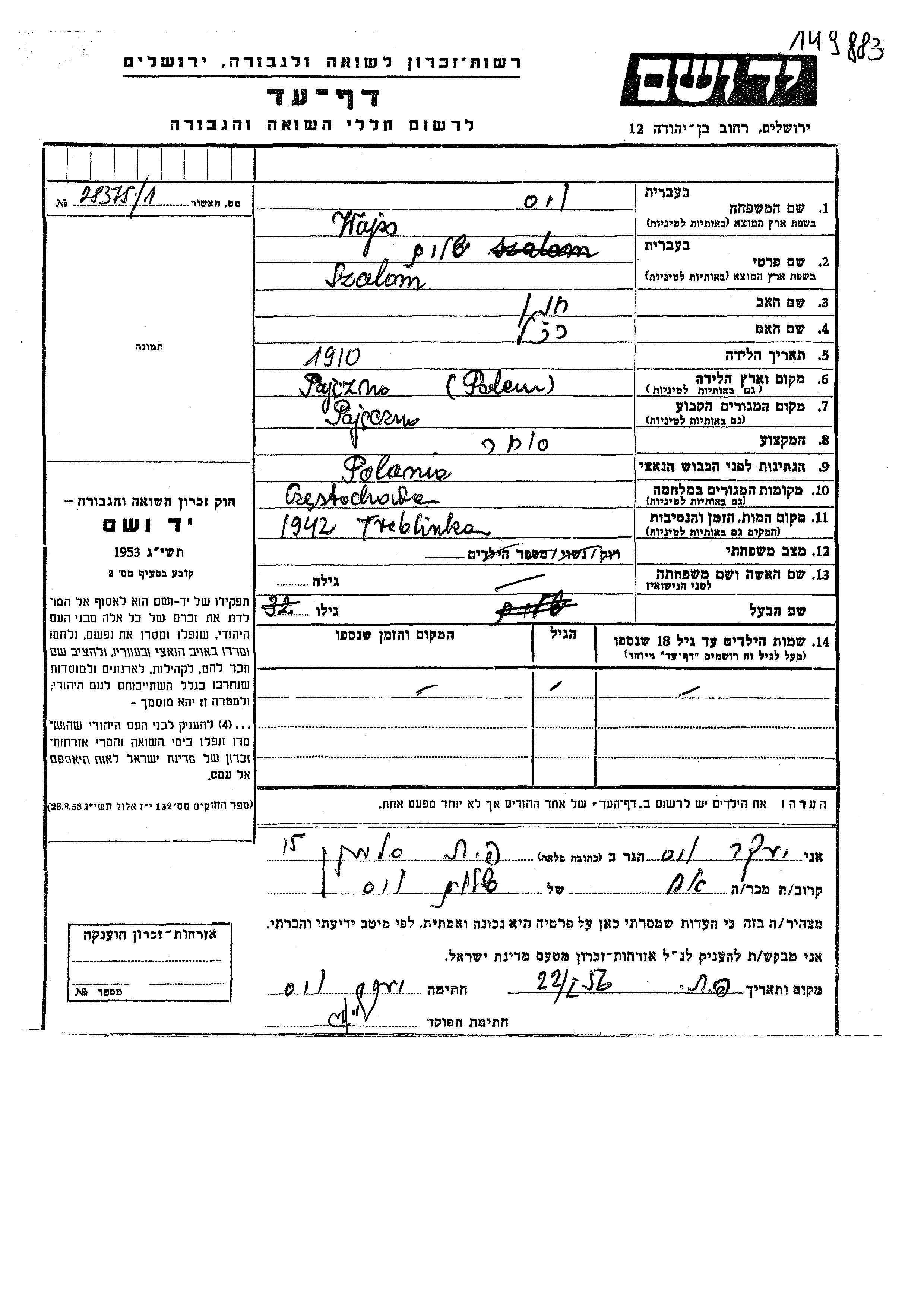 Szalom Wajss was born in Pajeczno, Poland, 1910 to Khanan and Ratzel. He was a merchant. Prior to WWII he lived in Pajeczno, Poland. During the war he was in Czestochowa, Poland. Szalom was murdered in the Shoah. Place of death: Treblinka, Poland, 1942.