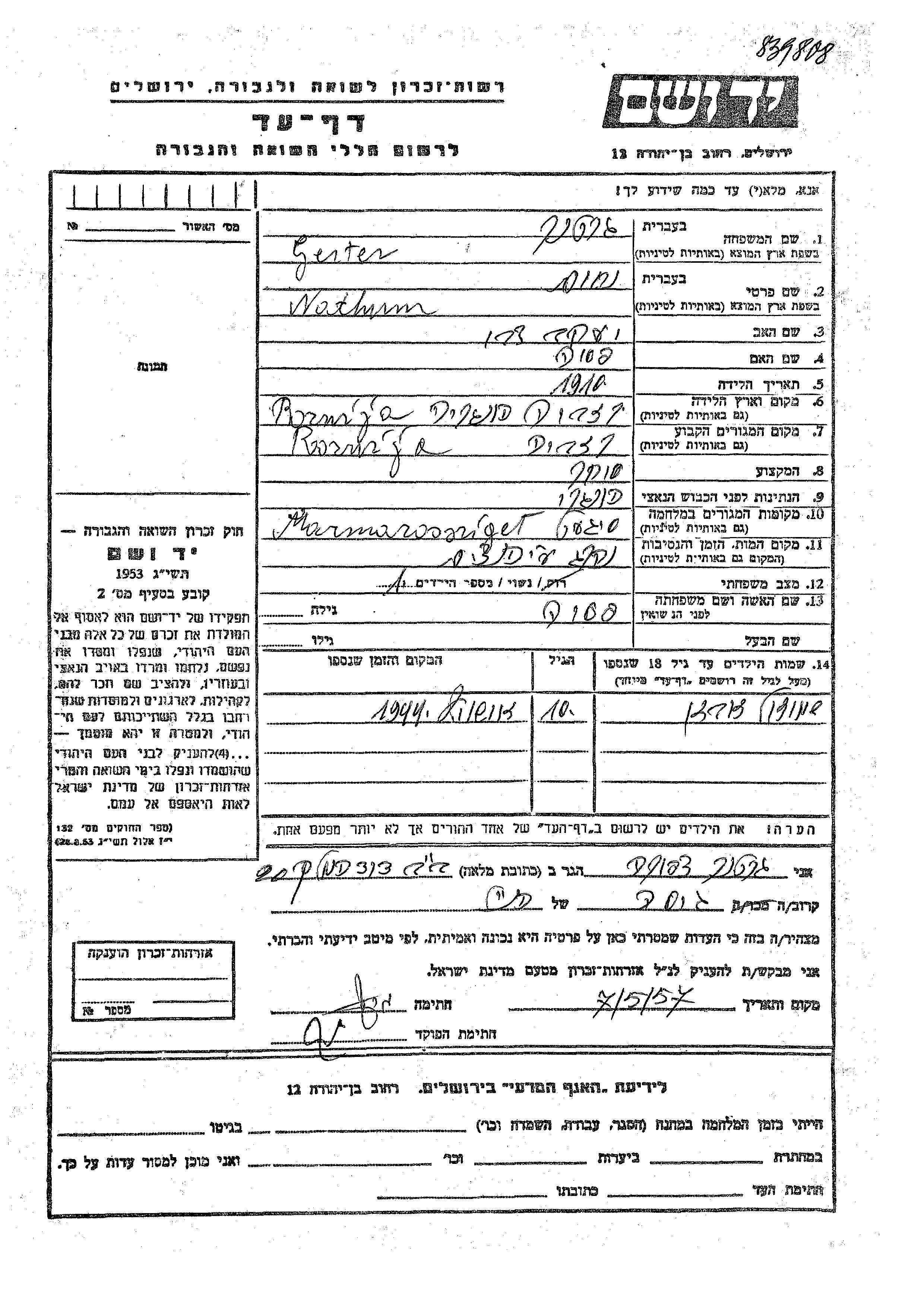 Yad Vashem - Pages of Testimony Names Memorial Collection