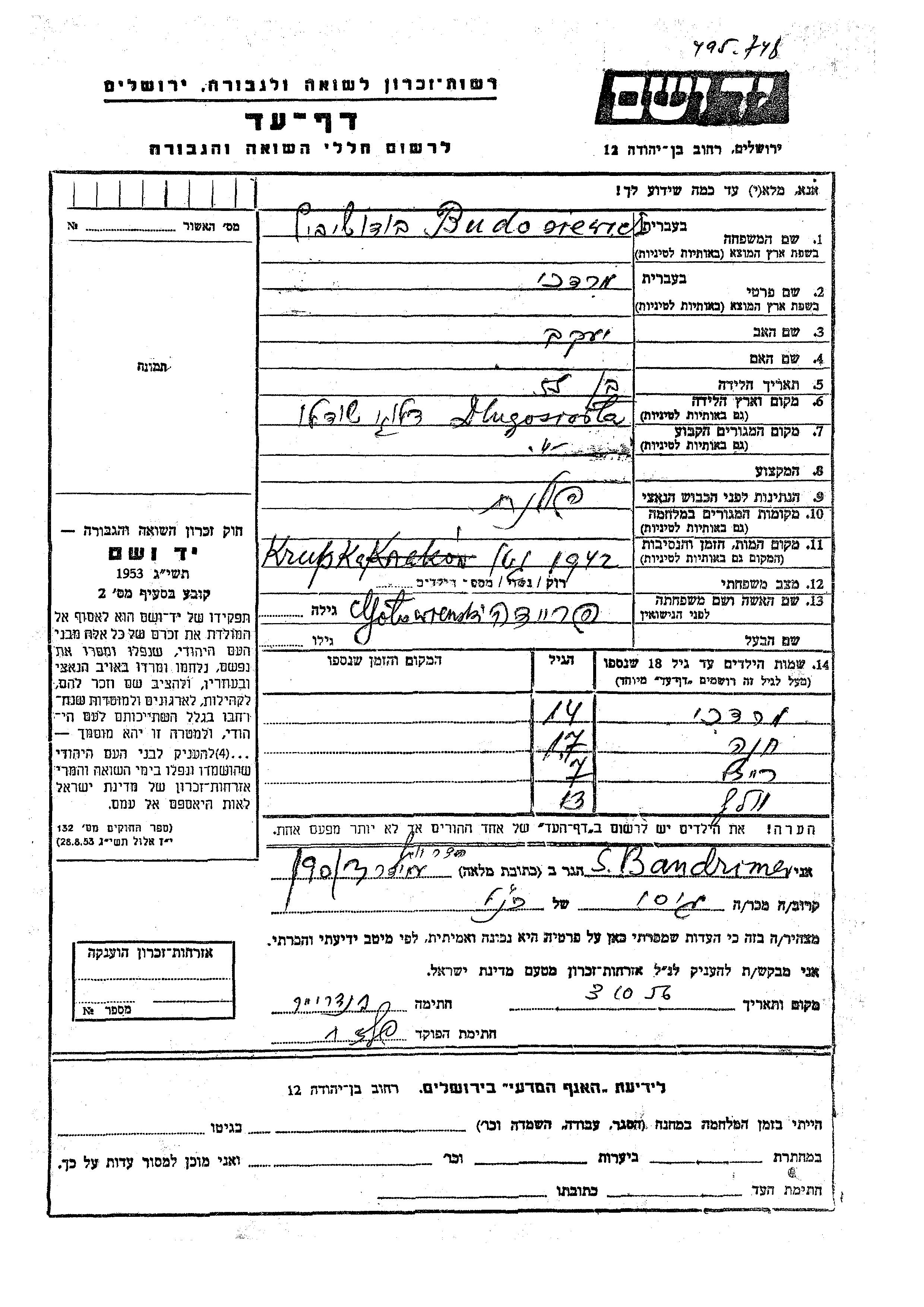Budosiewicz Volf Dlugosiodlo, Poland Page of Testimony