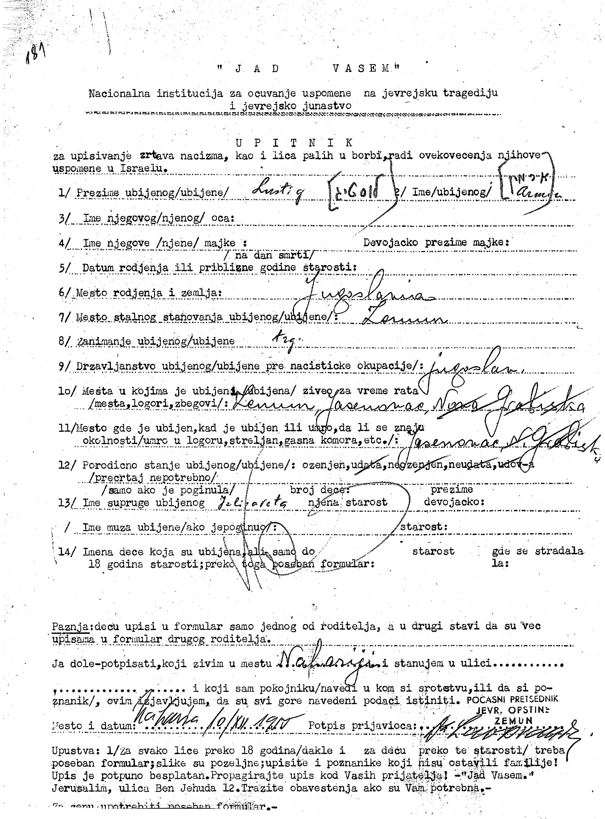 Lustig Armin Zemun, Yugoslavia Page of Testimony