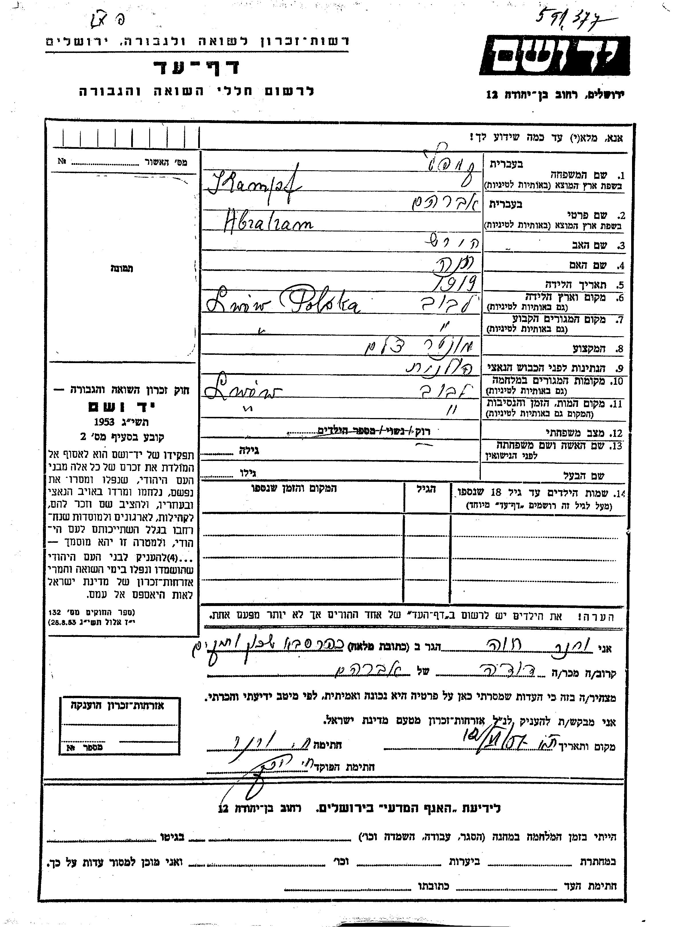 Kampf Abraham 1919 Lwow, Poland Page of Testimony