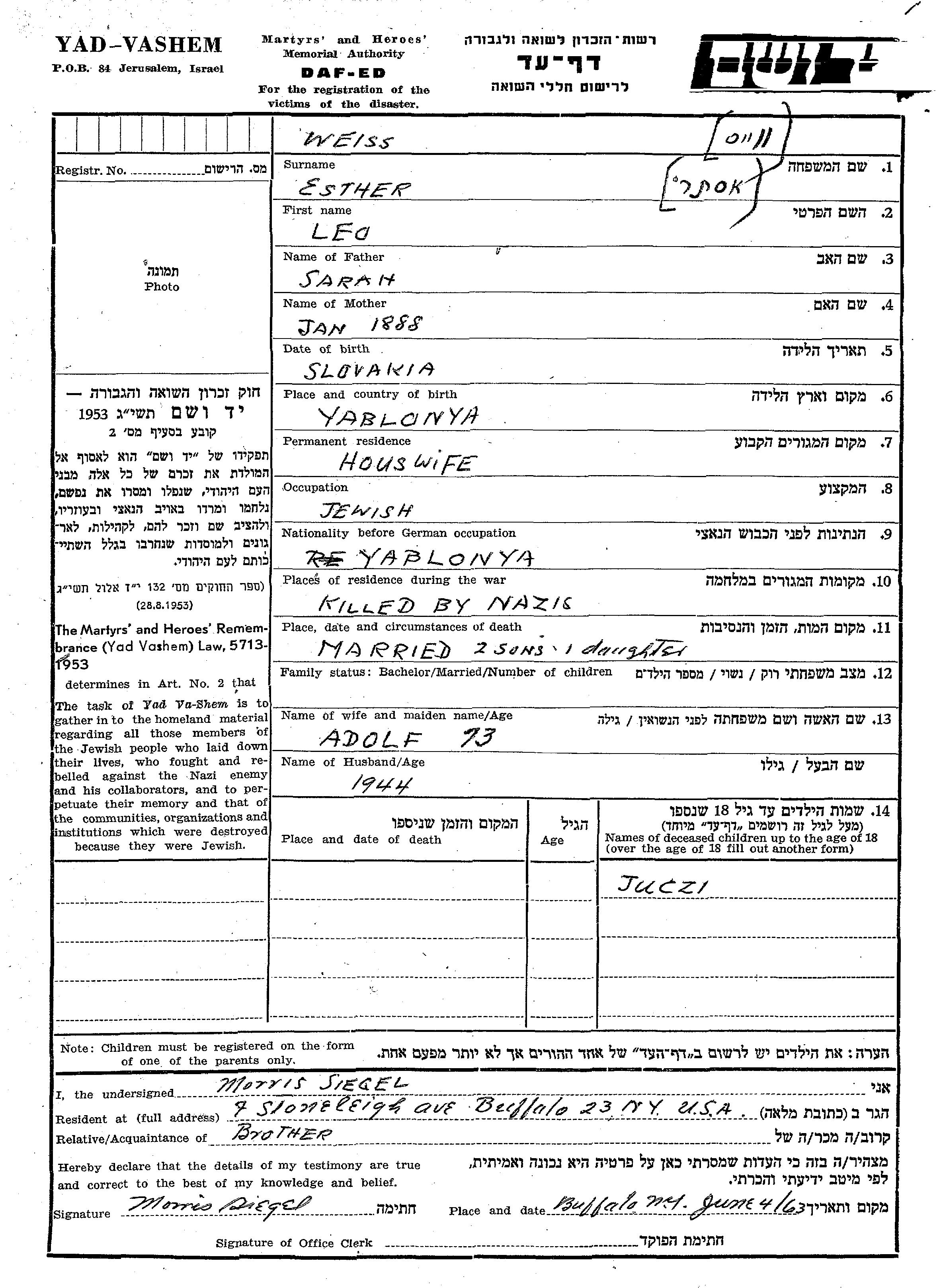 Weiss Esther 1888 Yablona, Romania Page of Testimony