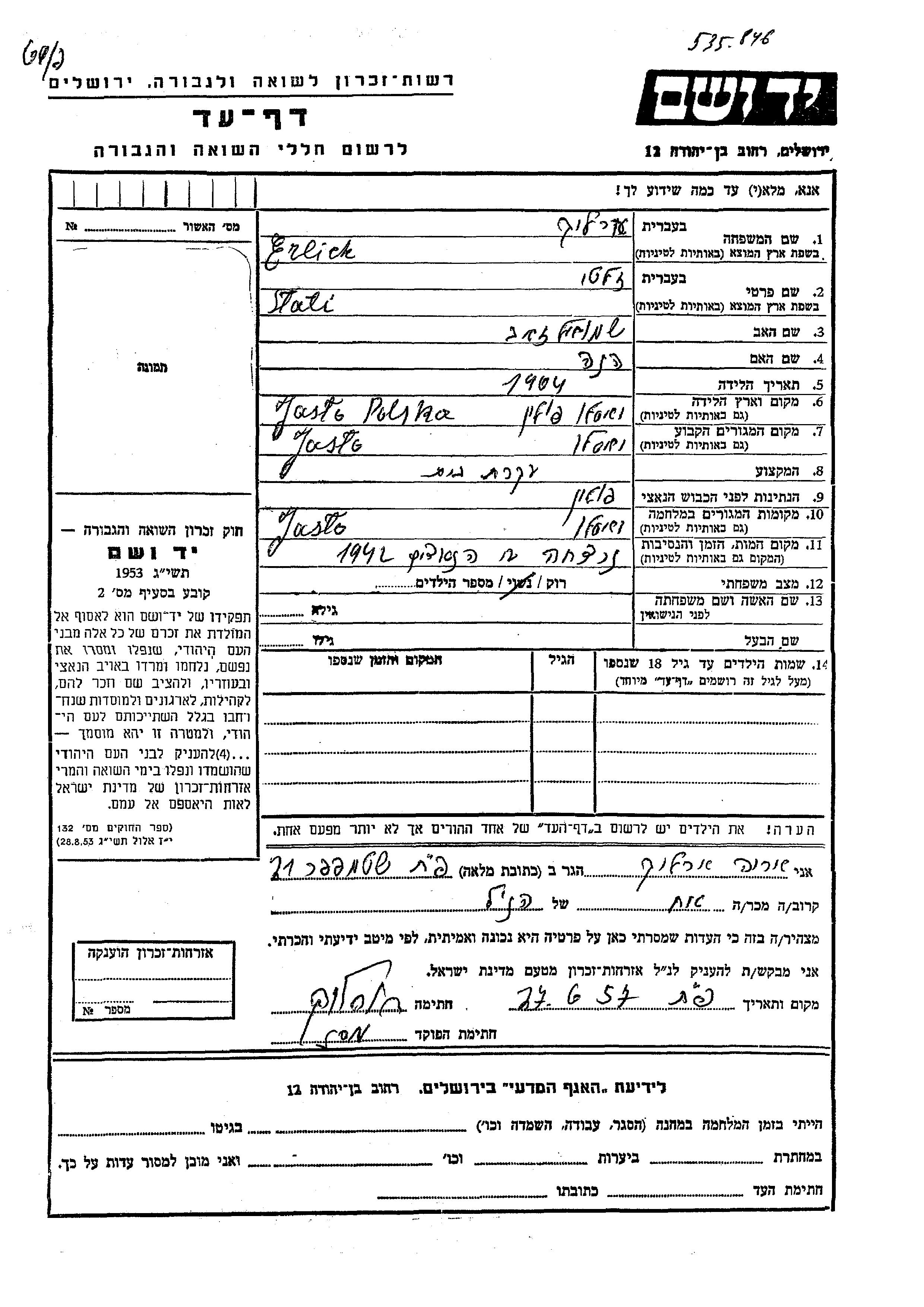 Erlich Slati 1904 Jaslo, Poland Page of Testimony