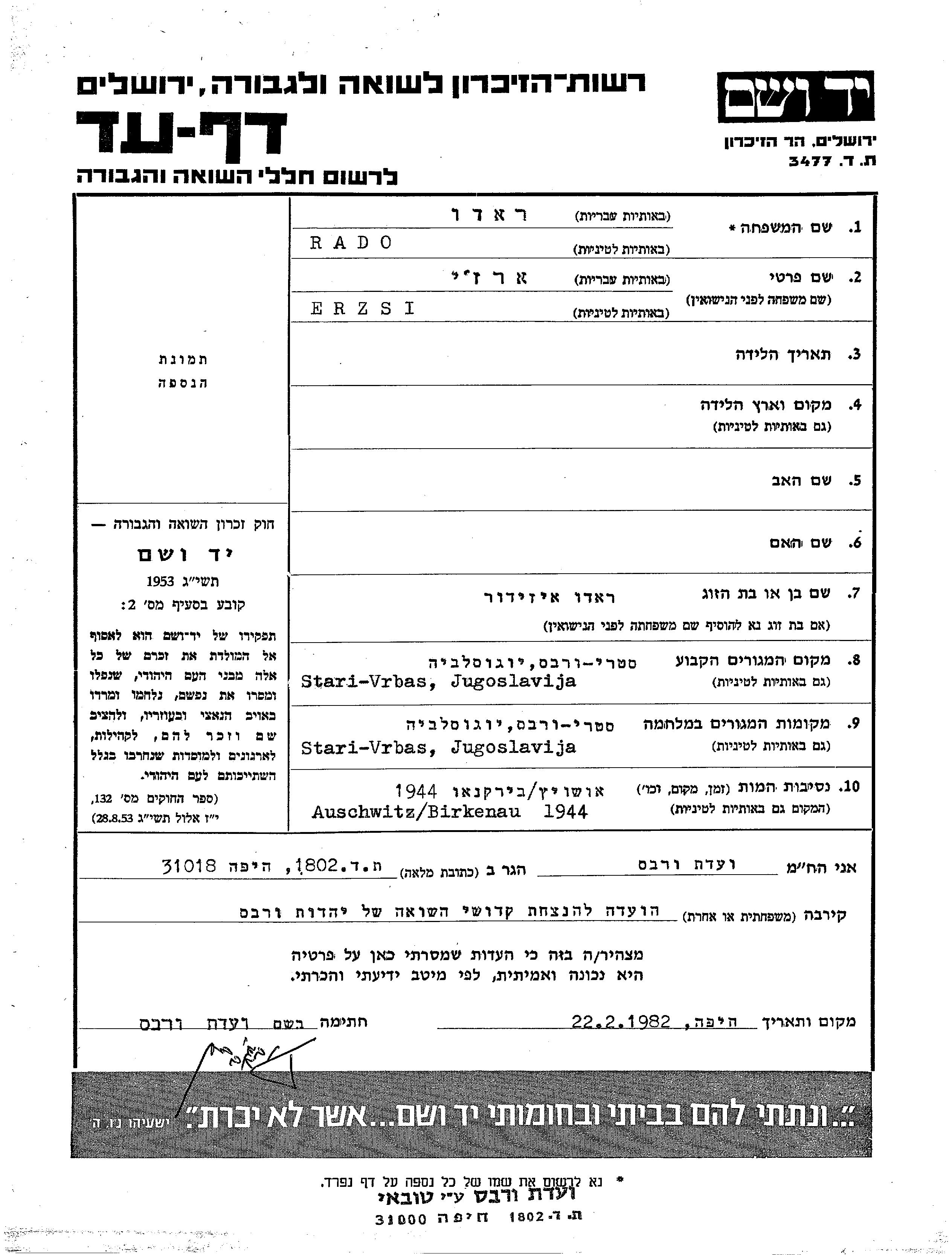 Rado Erzsi Stari Vrbas, Yugoslavia Page of Testimony