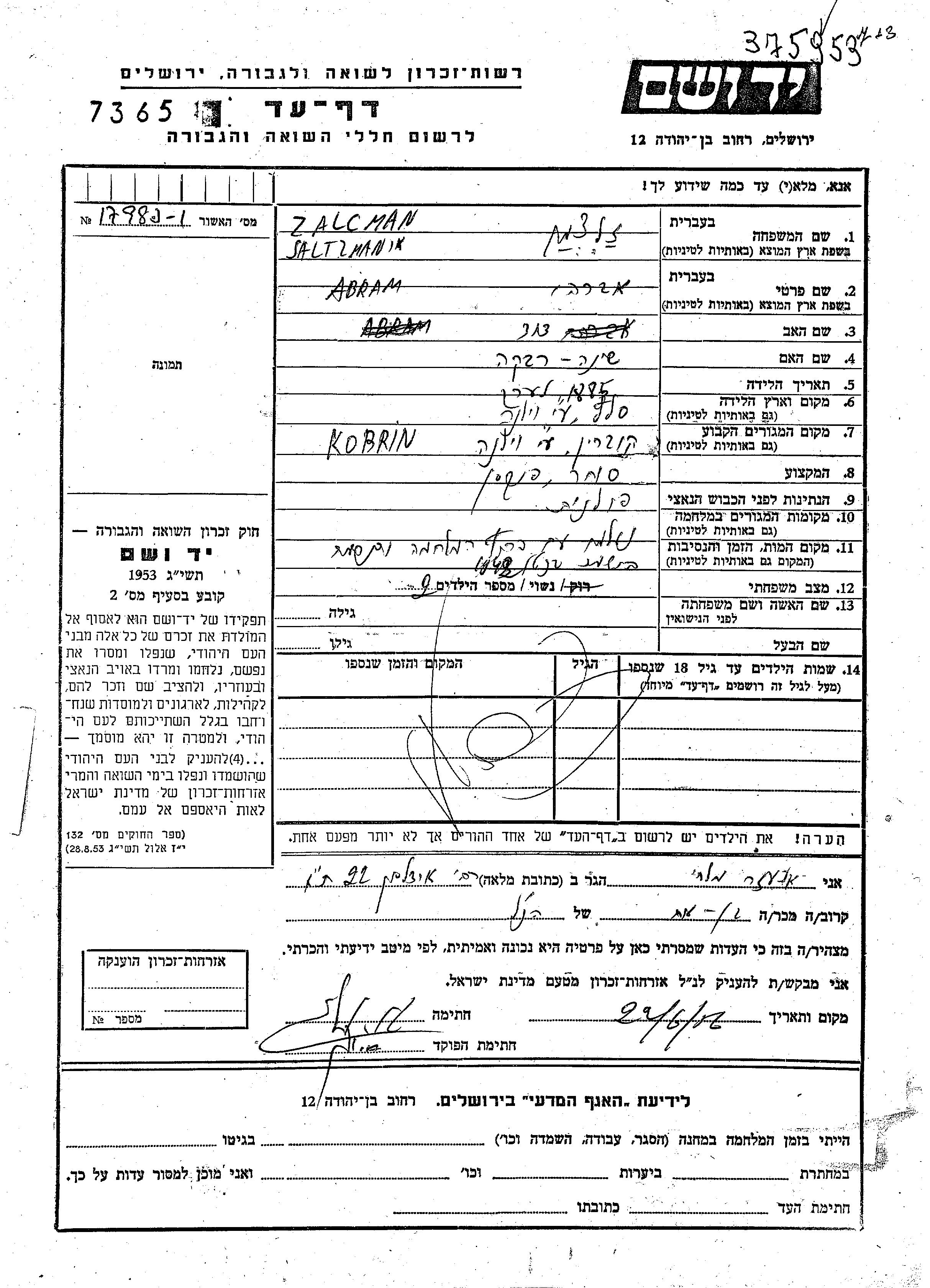 Zalcman Abram 1885 Kobrin, Poland Page of Testimony