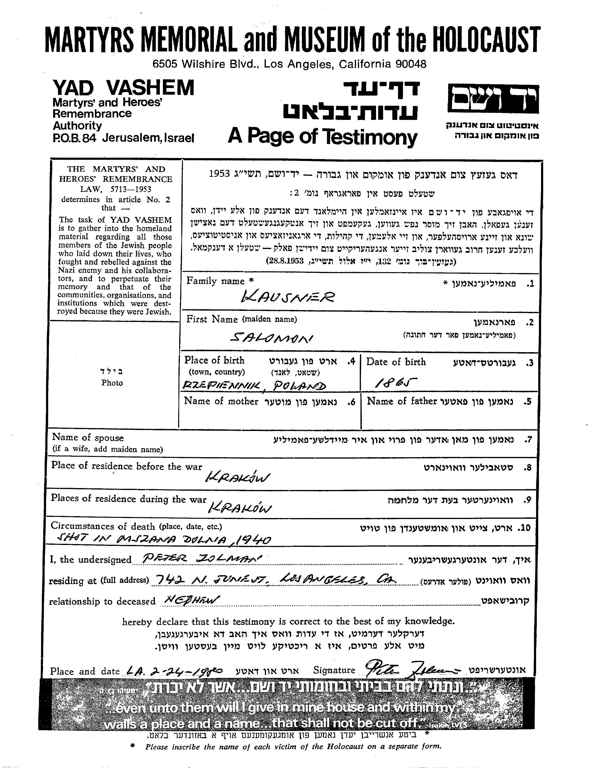 Salomon Kausner was born in Rzepiennik, Poland, 1865. Prior to WWII he lived in Krakow, Poland. During the war he was in Krakow, Poland. Salomon was murdered in the Shoah. Place of death: Mszana Dolna, Murder Site, 1940.
