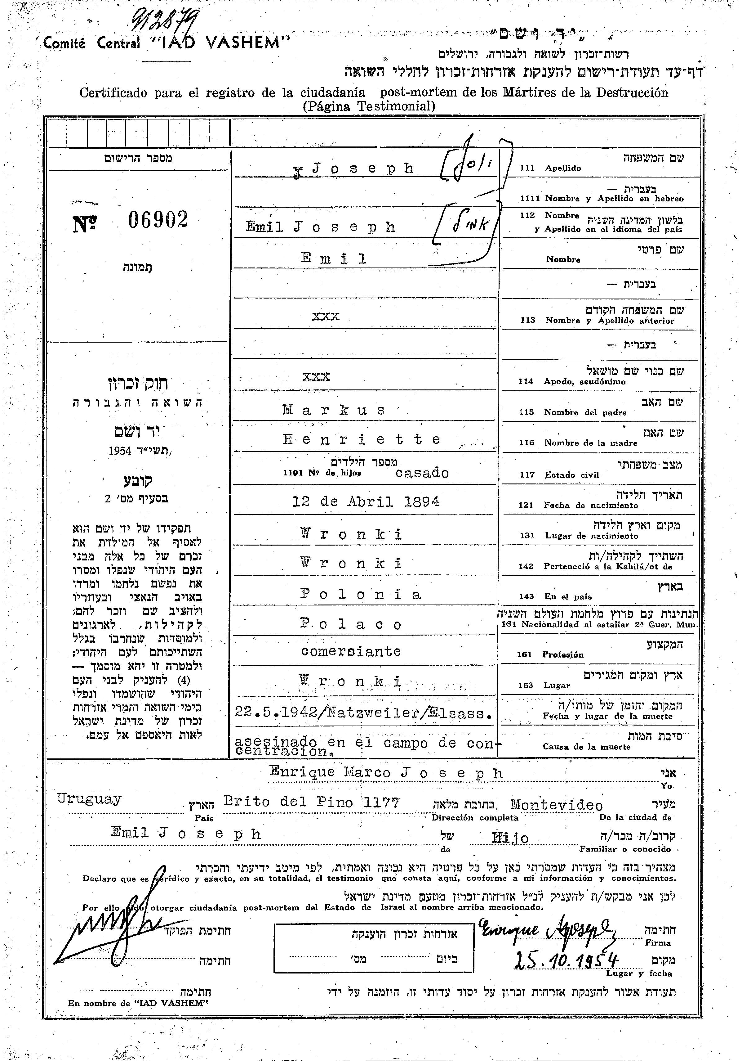 Joseph Emil 1894 Wronki, Poland Page of Testimony