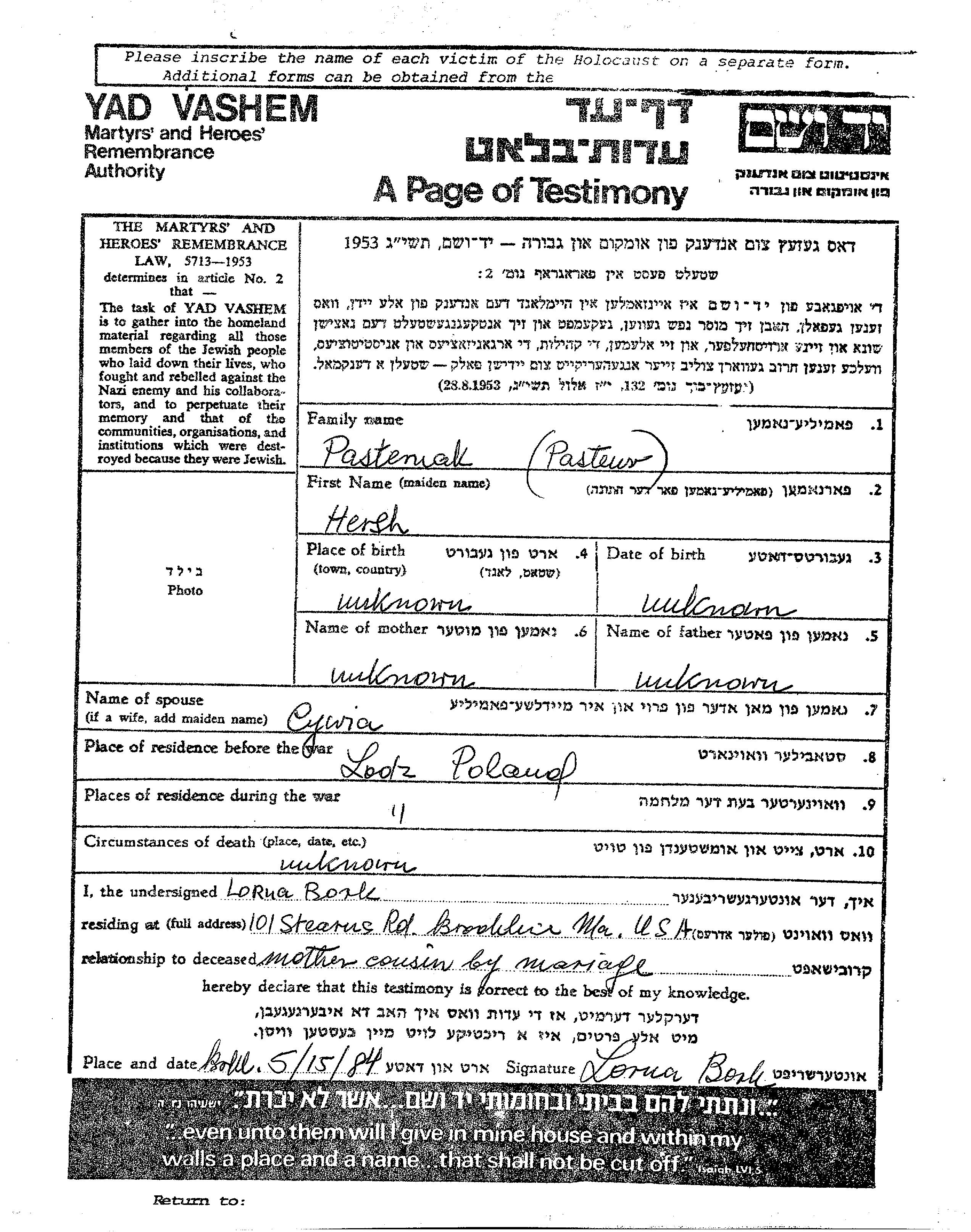 Pasternak Pasteur Hersh Lodz, Poland Page of Testimony