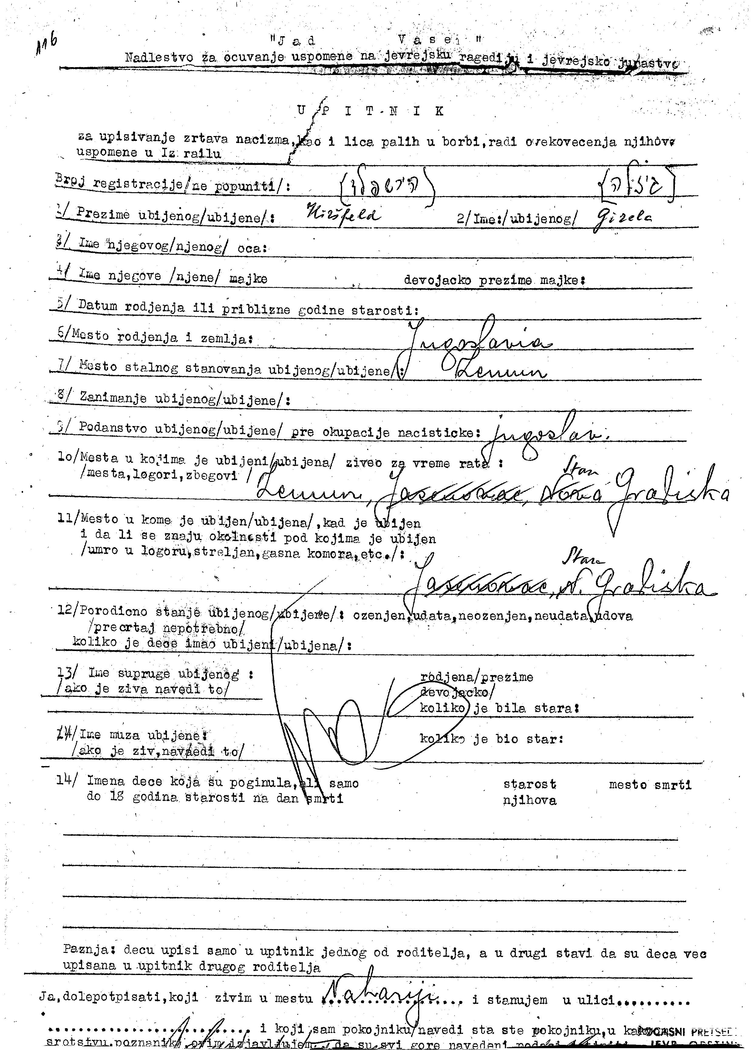 Hirsfeld Gizela Zemun, Yugoslavia Page of Testimony