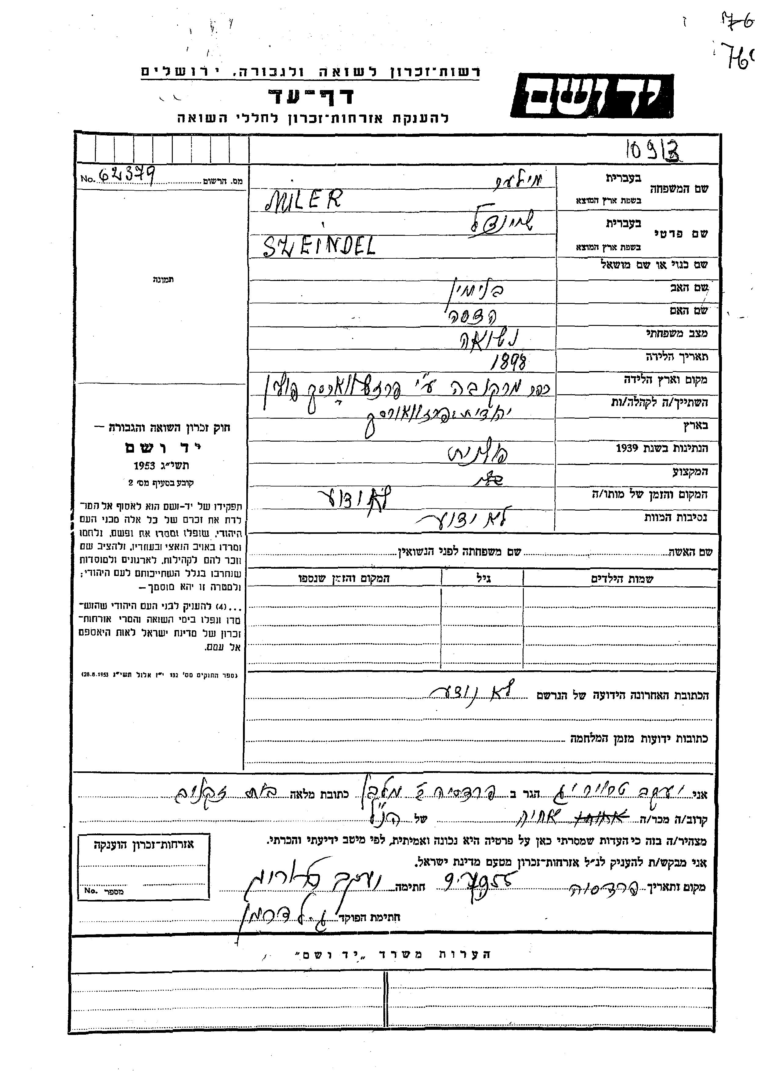 Szeindel Miler was born in Markowa, Poland, 1898 to Beniamin and Hadasa. She was an undeciphered and married. Prior to WWII she lived in Markowa, Poland. Szeindel was murdered in the Shoah.