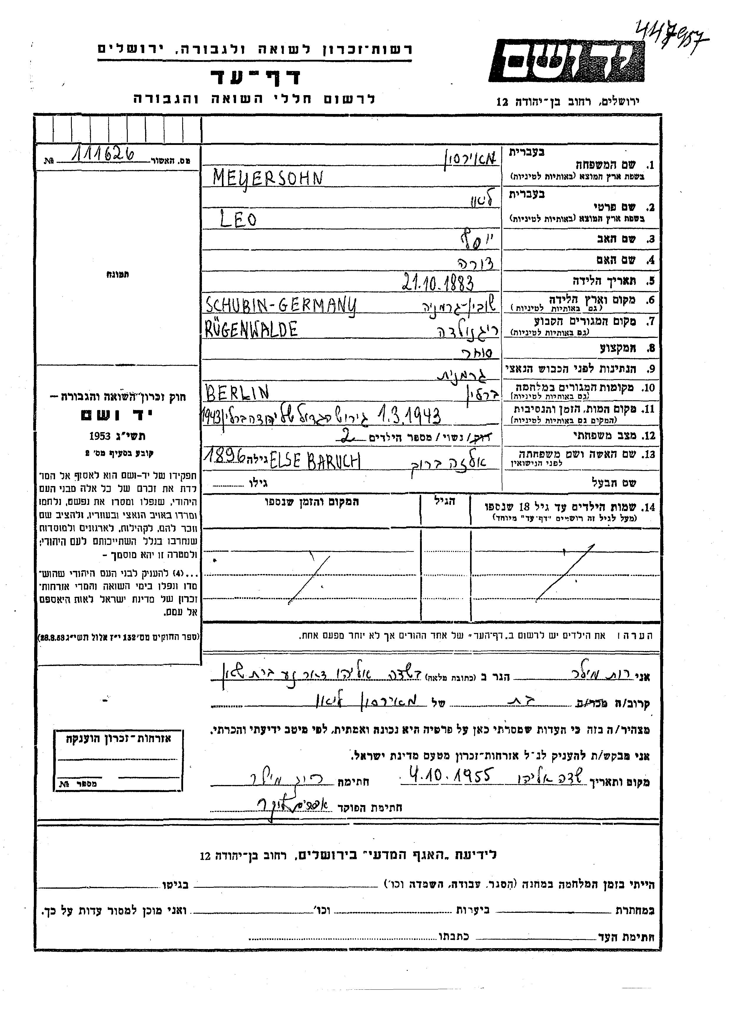 Leo Meyersohn was born in Schubin, Poland, 1883 to Yosef and Dora. He was a merchant and married to Else nee Baruch. Prior to WWII he lived in Ruegenwalde, Germany. During the war he was in Berlin, Germany.