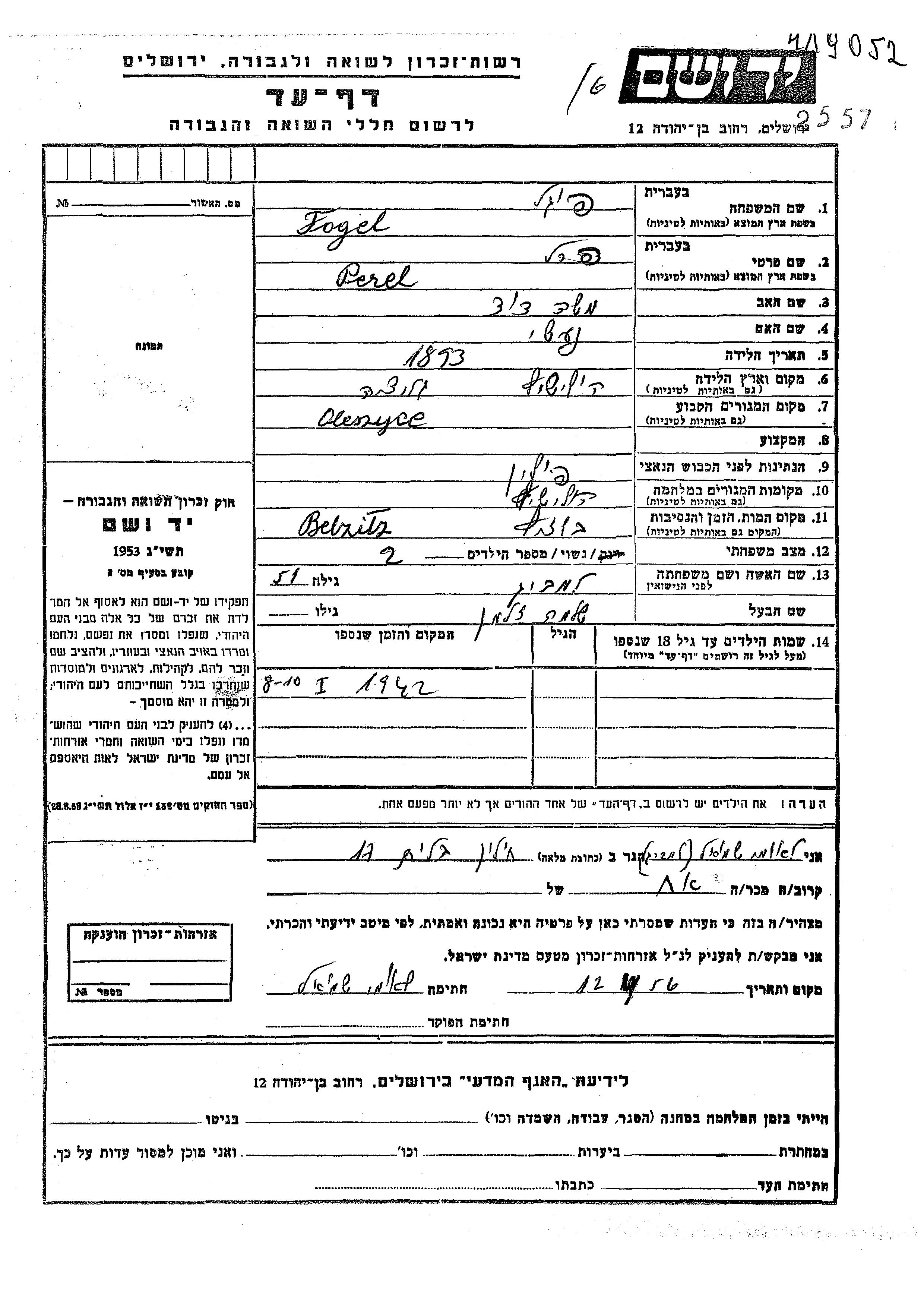 Perel Fogel nee Lambig was born in Oleszyce, Poland, 1893 to Moshe David and Neshi. She was married to Shlomo Zalman. Prior to WWII she lived in Oleszyce, Poland. During the war she was in Oleszyce, Poland. Perel was murdered in the Shoah. Place of death: Belzec, Poland, 08/01/1942.