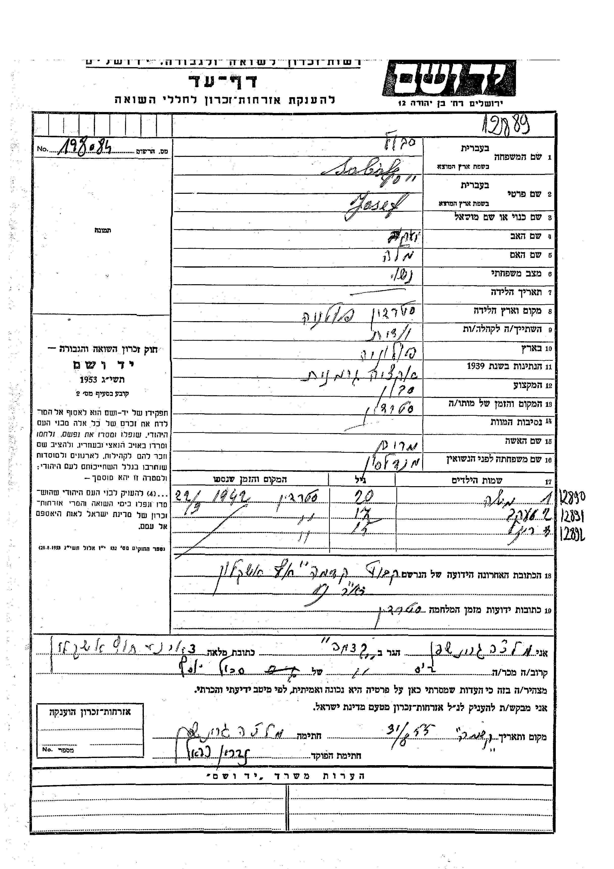 Josef Sabol was born in Sterdyn, Poland to Yaakov and Mala. He was a porter and married to Miriam nee Mendelson. Prior to WWII he lived in Sterdyn, Poland. During the war he was in Sterdyn, Poland. Josef was murdered in the Shoah. Place of death: Sterdyn, Poland.