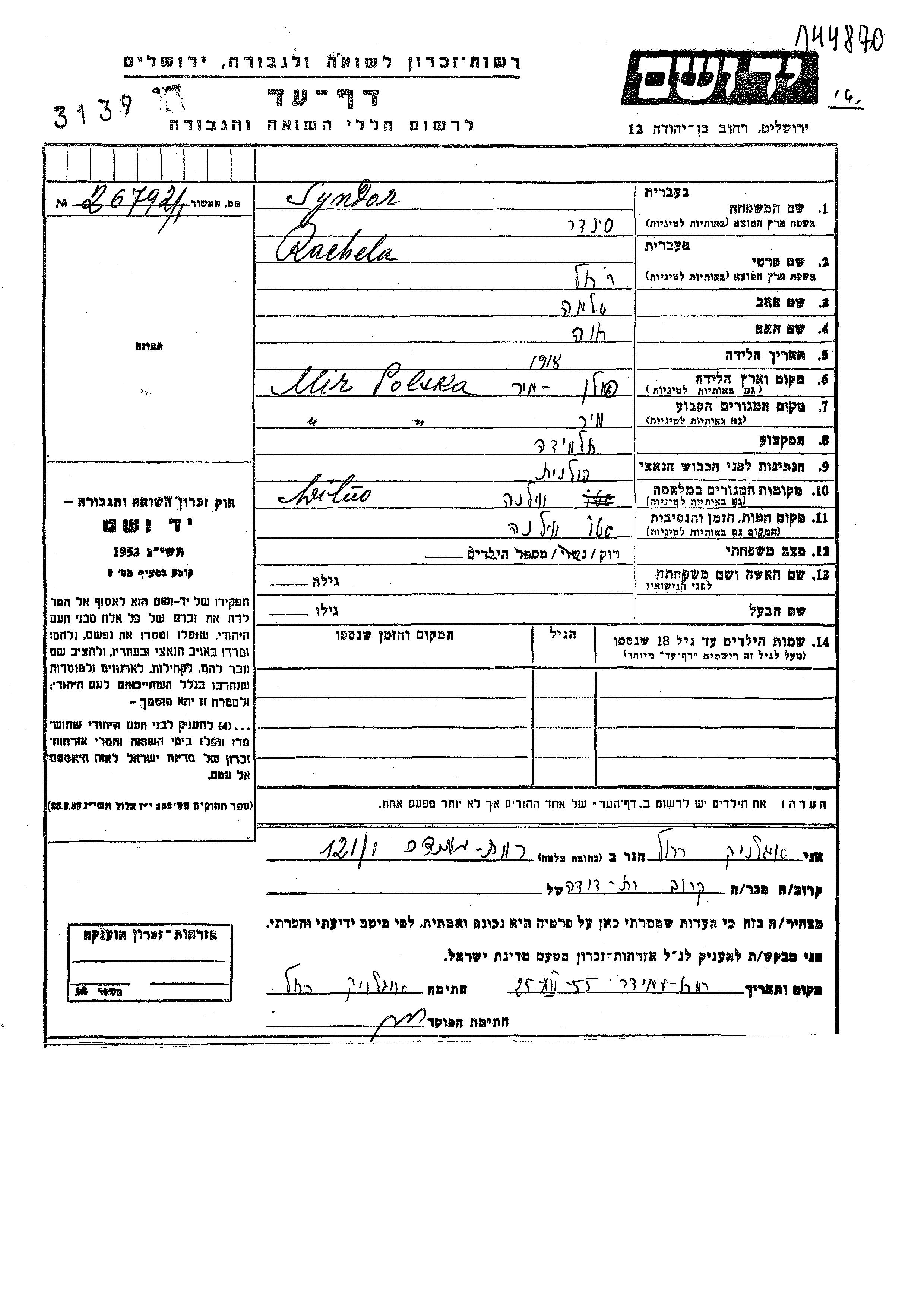 Rachela Syndor was born in Mir, Poland, 1918 to Shlomo and Khava. She was a pupil and single. Prior to WWII she lived in Mir, Poland. During the war she was in Wilno, Poland. Rachela was murdered in the Shoah. Place of death: Wilno, Poland.