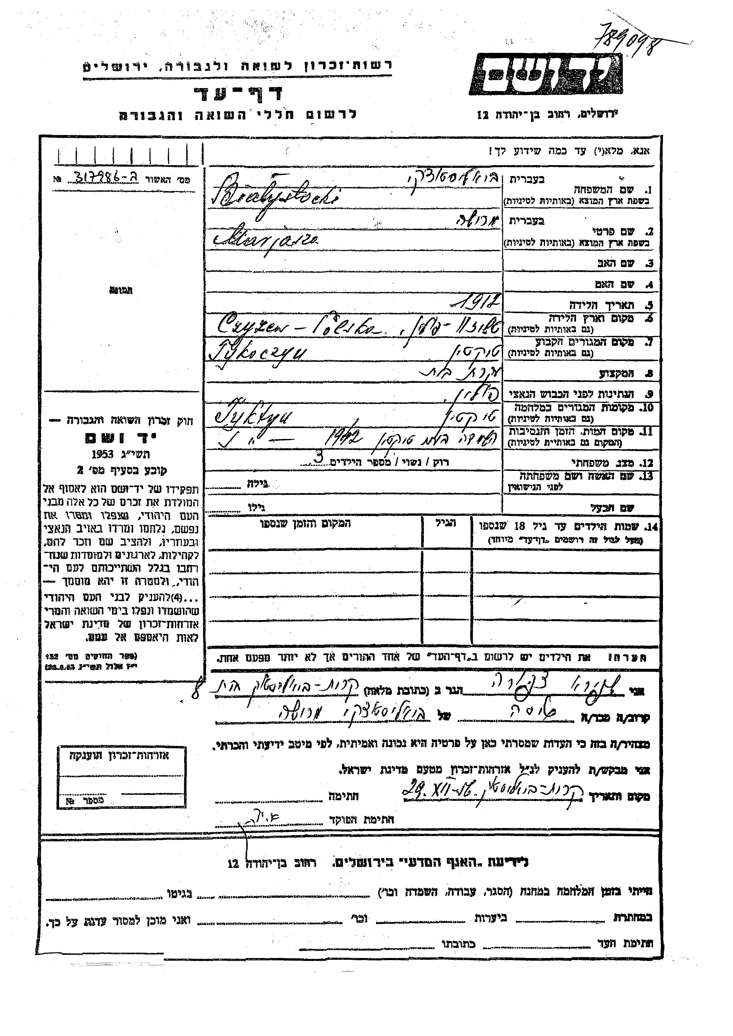 Marjasza Bialystocki was born in Czyzew, Poland, 1912. She was a housewife. Prior to WWII she lived in Tykocin, Poland. During the war she was in Tykocin, Poland. Marjasza was murdered in the Shoah. Place of death: Tykocin, Poland, 1942.