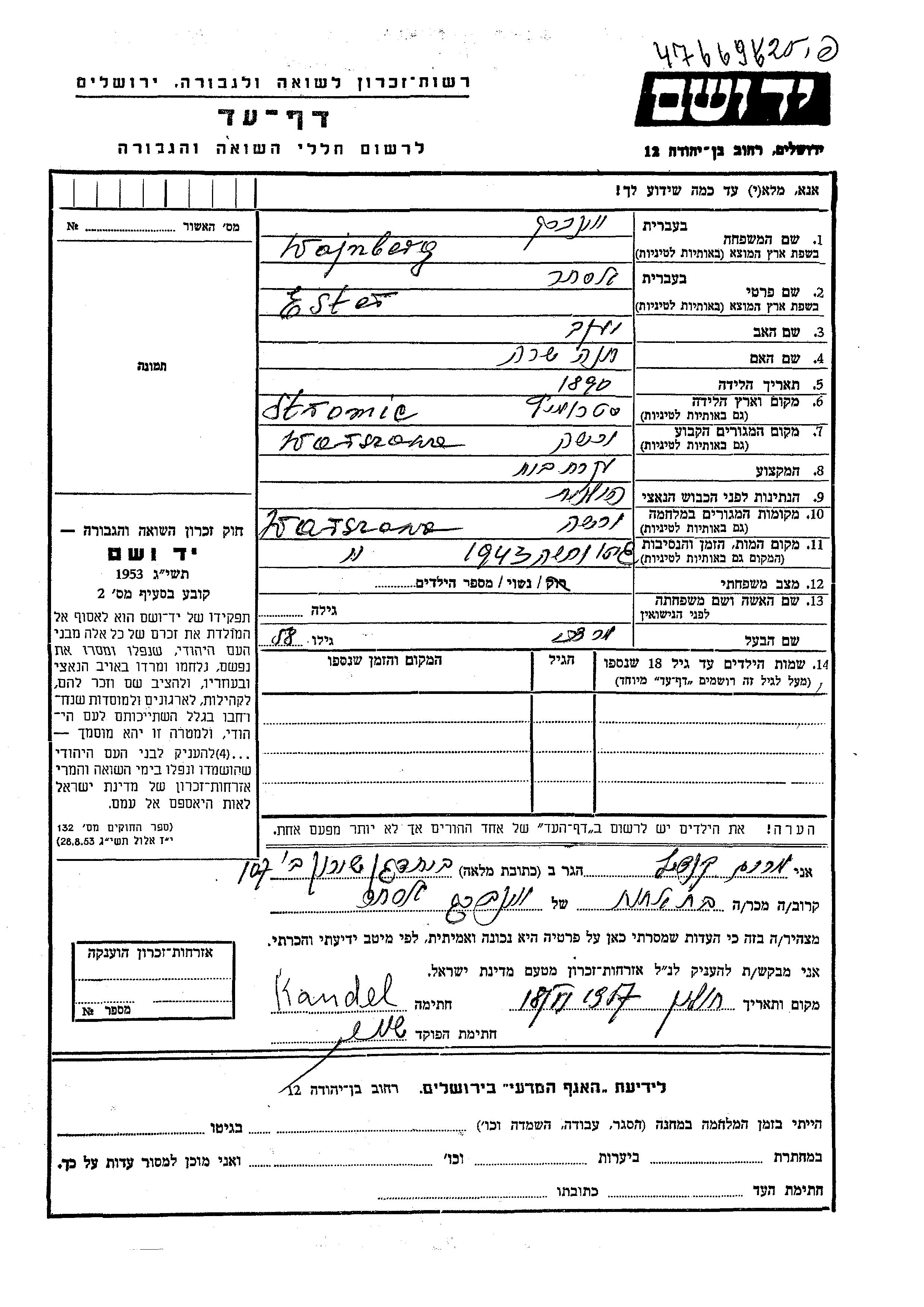 Ester Wojnberg was born in Stromiec, Poland, 1890 to Yaakov and Khana Sara. She was a housewife and married to Mordekhai. Prior to WWII she lived in Warszawa, Poland. During the war she was in Warszawa, Poland. Ester was murdered in the Shoah. Place of death: Warszawa, Poland, 1943.