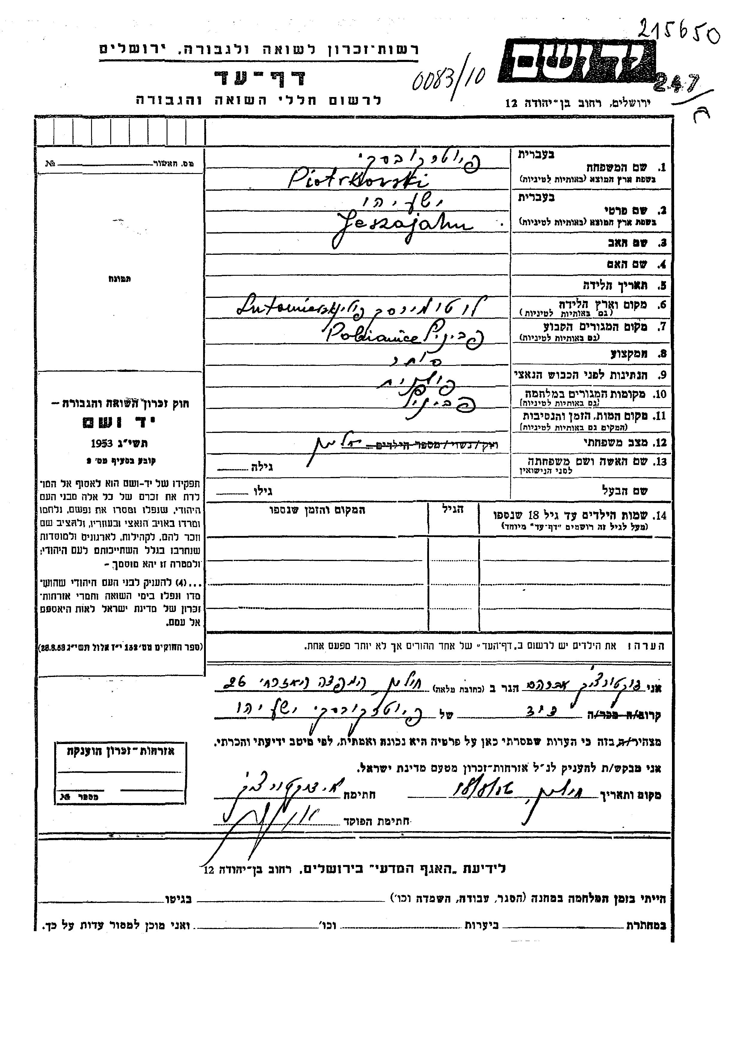 Jeszajahu Piotrkowski was born in Lutomiersk, Poland. He was a merchant and a widower. Prior to WWII he lived in Pabianice, Poland. During the war he was in Pabianice, Poland. Jeszajahu was murdered in the Shoah.