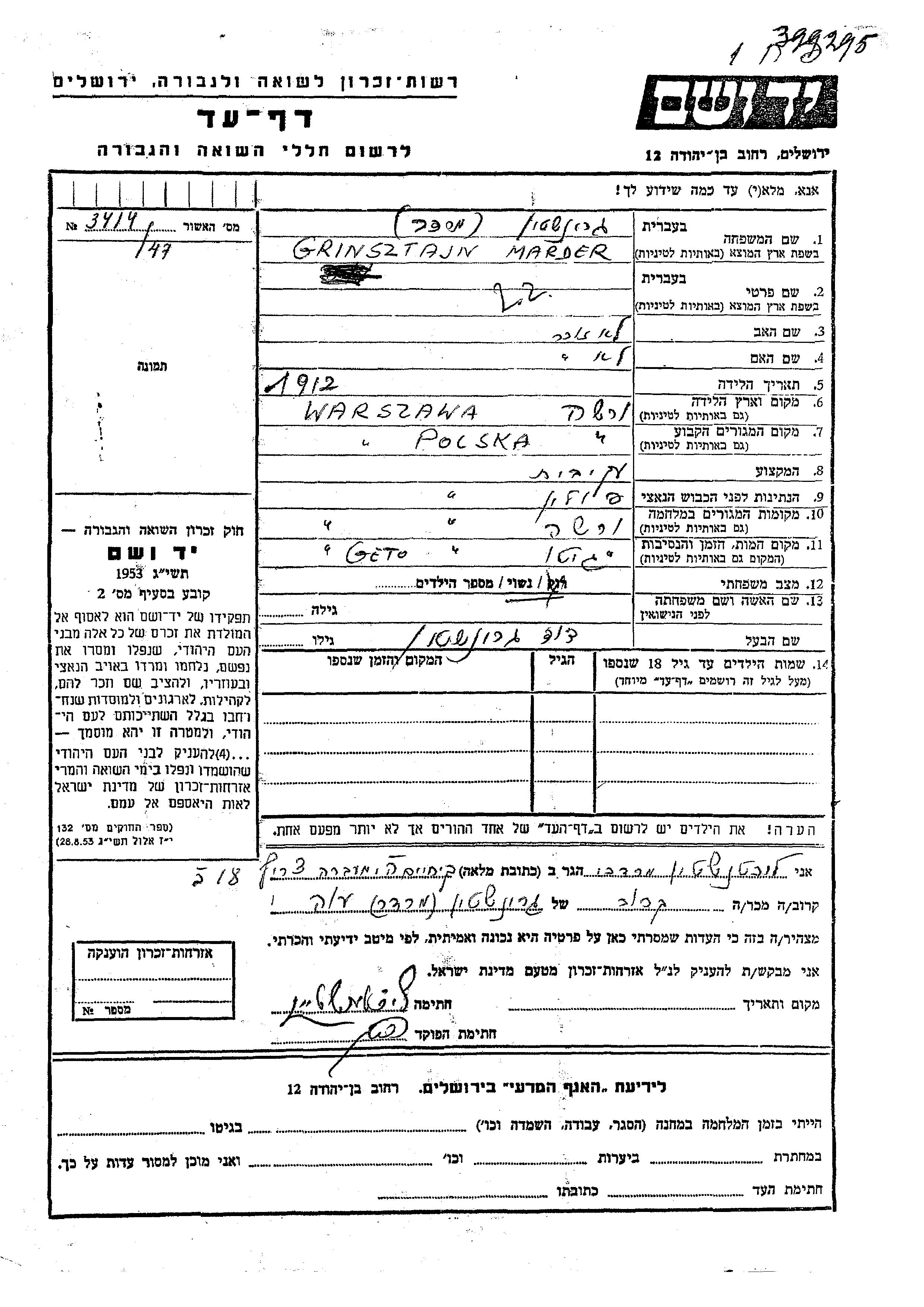 Grinsztain First name unknown 1912 Warszawa, Poland Page of Testimony