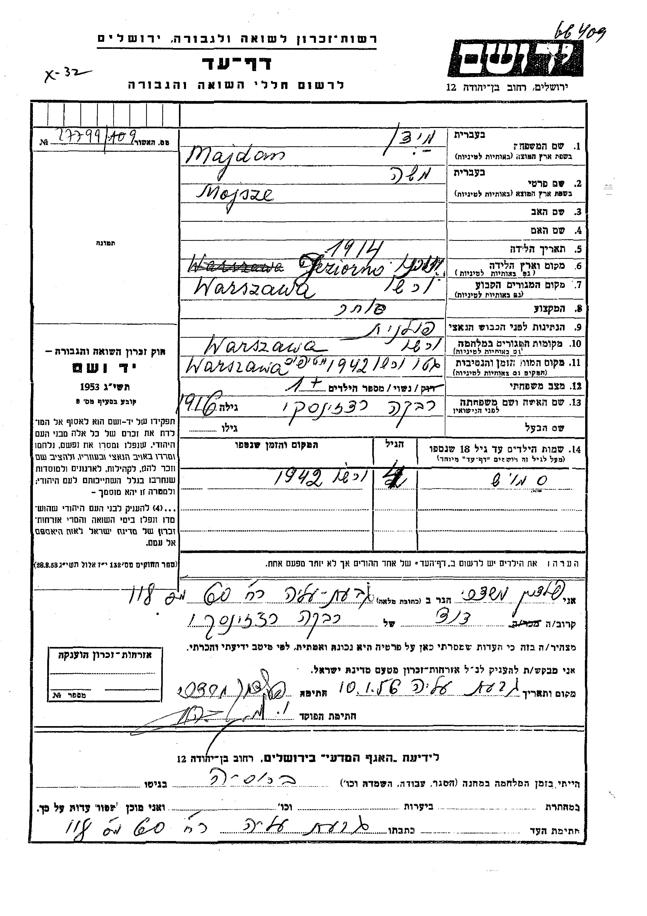 Mojsze Majdan Mieden was born in Jeziorna, Poland, 1914. He was a merchant and married to Rivka nee Radzinski. Prior to WWII he lived in Warszawa, Poland. During the war he was in Warszawa, Poland. Mojsze was murdered in the Shoah. Place of death: Warszawa, Poland, 1942.