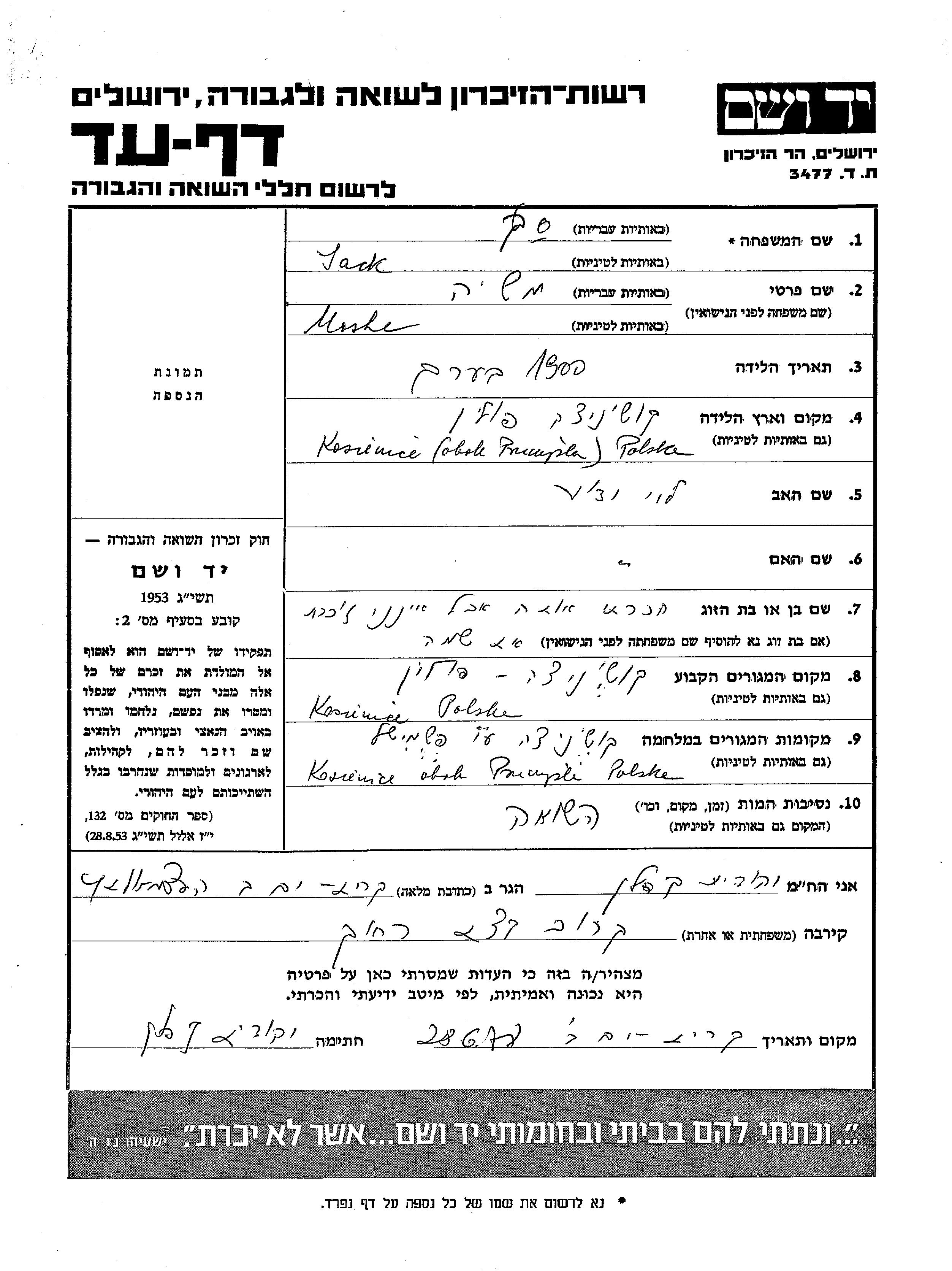 Moshe Sack was born in Kosienice, Poland, 1900. He was married. Prior to WWII he lived in Kosienice, Poland. During the war he was in Kosienice, Poland. Moshe was murdered in the Shoah.