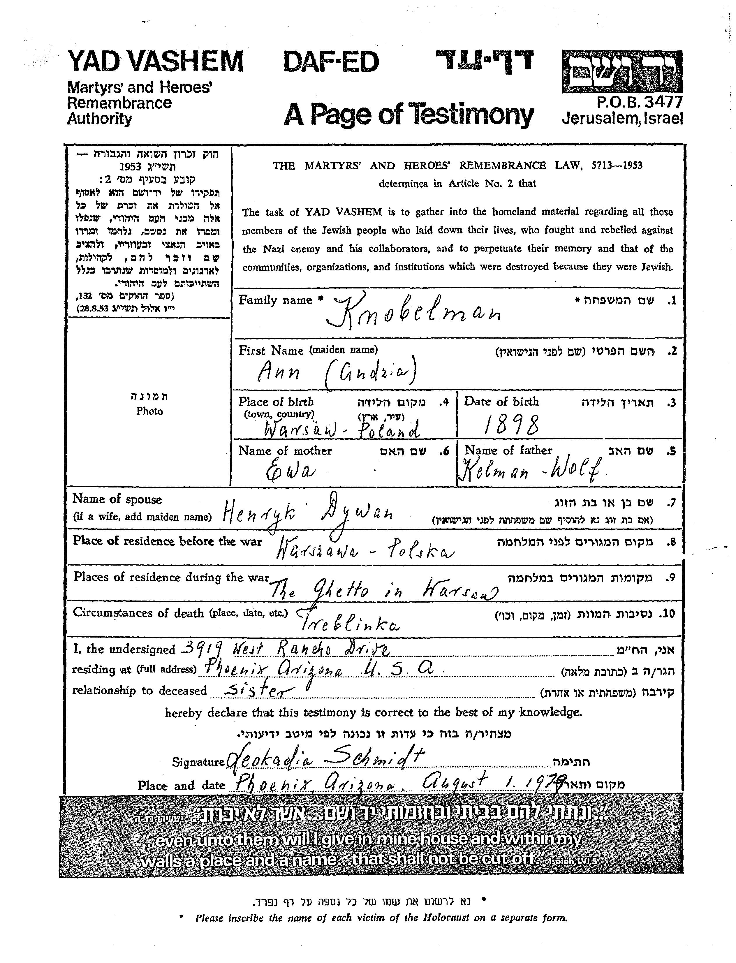 Ann Andzia Knobelman nee Kelman was born in Warsaw, Poland, 1898 to Kelman Wolf and Ewa. Prior to WWII she lived in Warsaw, Poland. During the war she was in Warsaw, Poland. Ann Andzia was murdered in the Shoah. Place of death: Treblinka, Poland.
