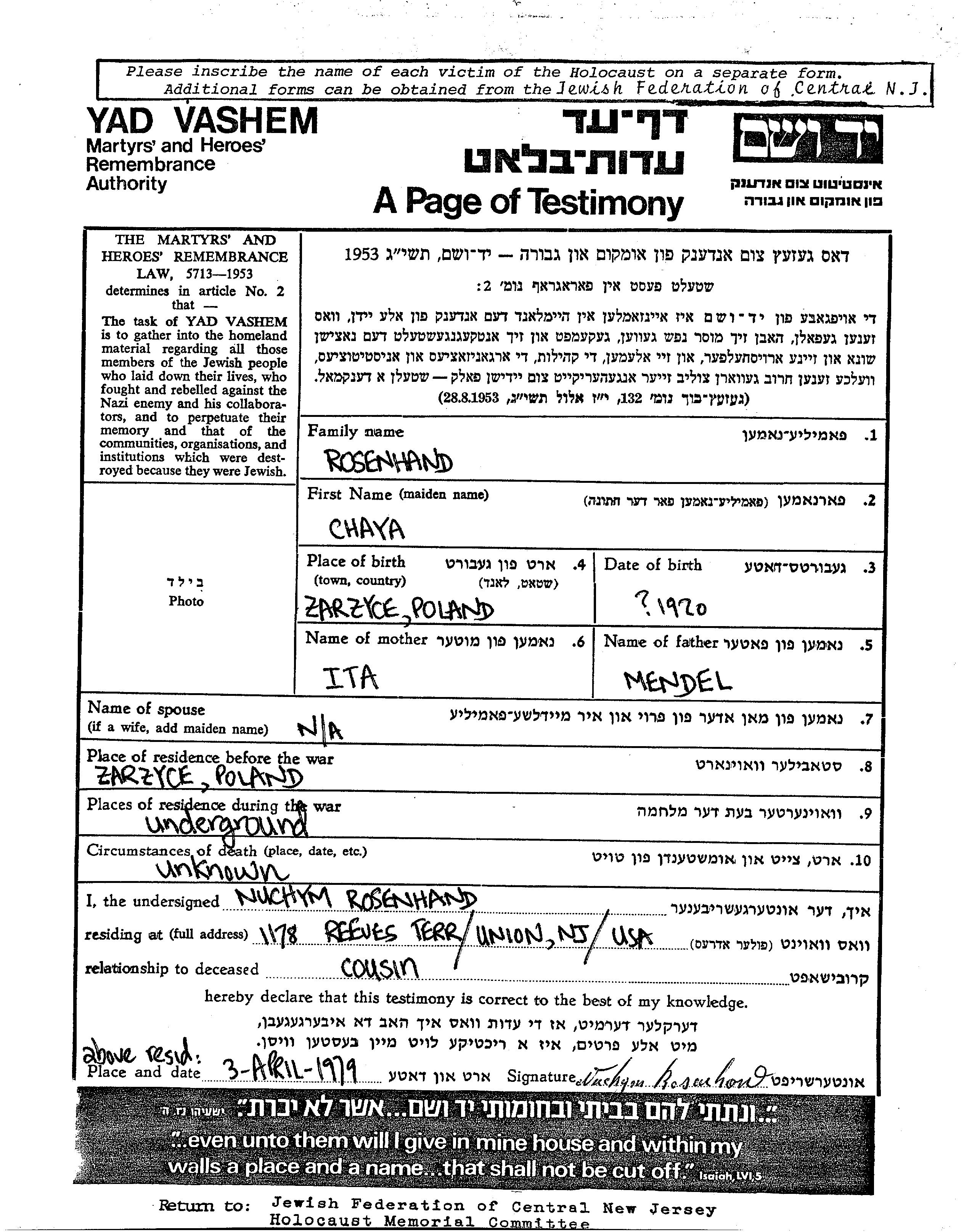 Rosenhand Chaya 1920 Zarzyce, Poland Page of Testimony
