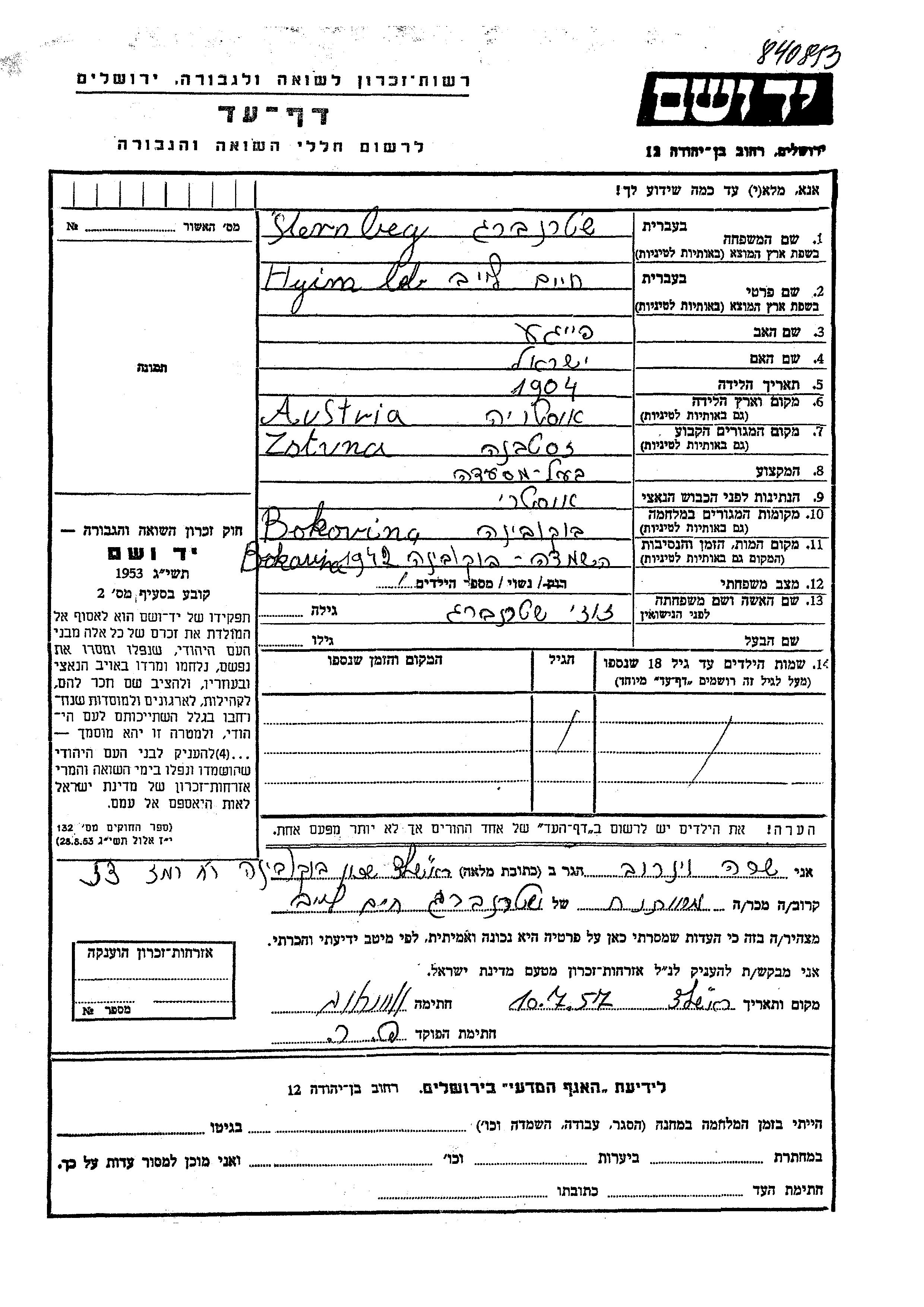 Sternberg Hyim Leb 1904 Zastavna, Romania Page of Testimony