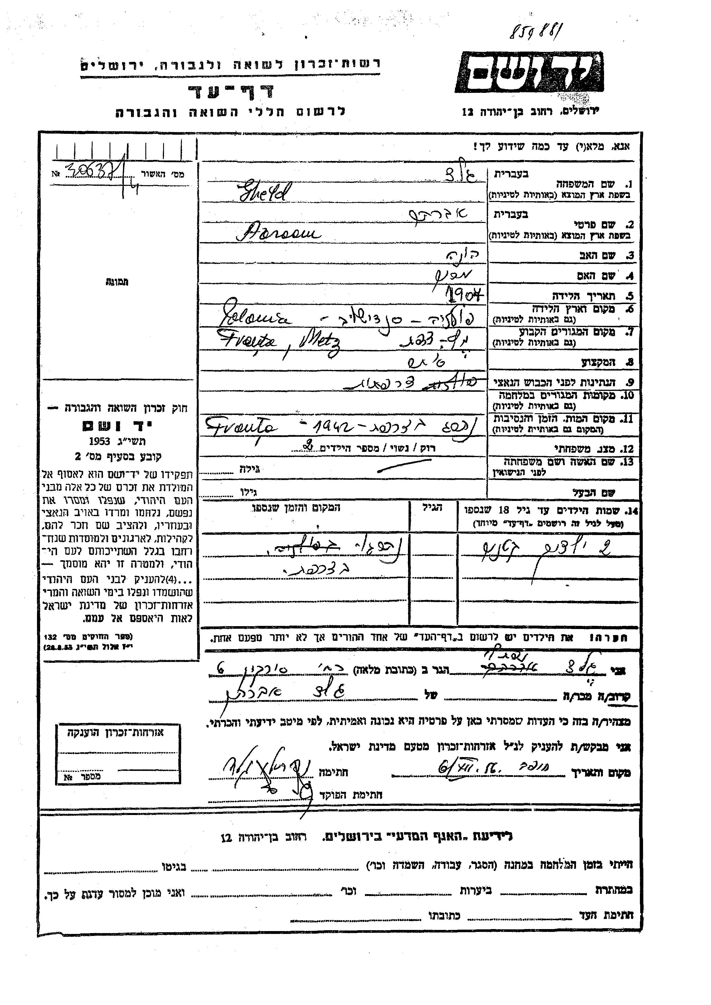 Abraam Gheld was born in Sedziszow Malopolski, Poland, 1907 to Hune and Miriam. He was a merchant and married. Prior to WWII he lived in Metz, France. Abraam was murdered in the Shoah. Place of death: France, 1942.