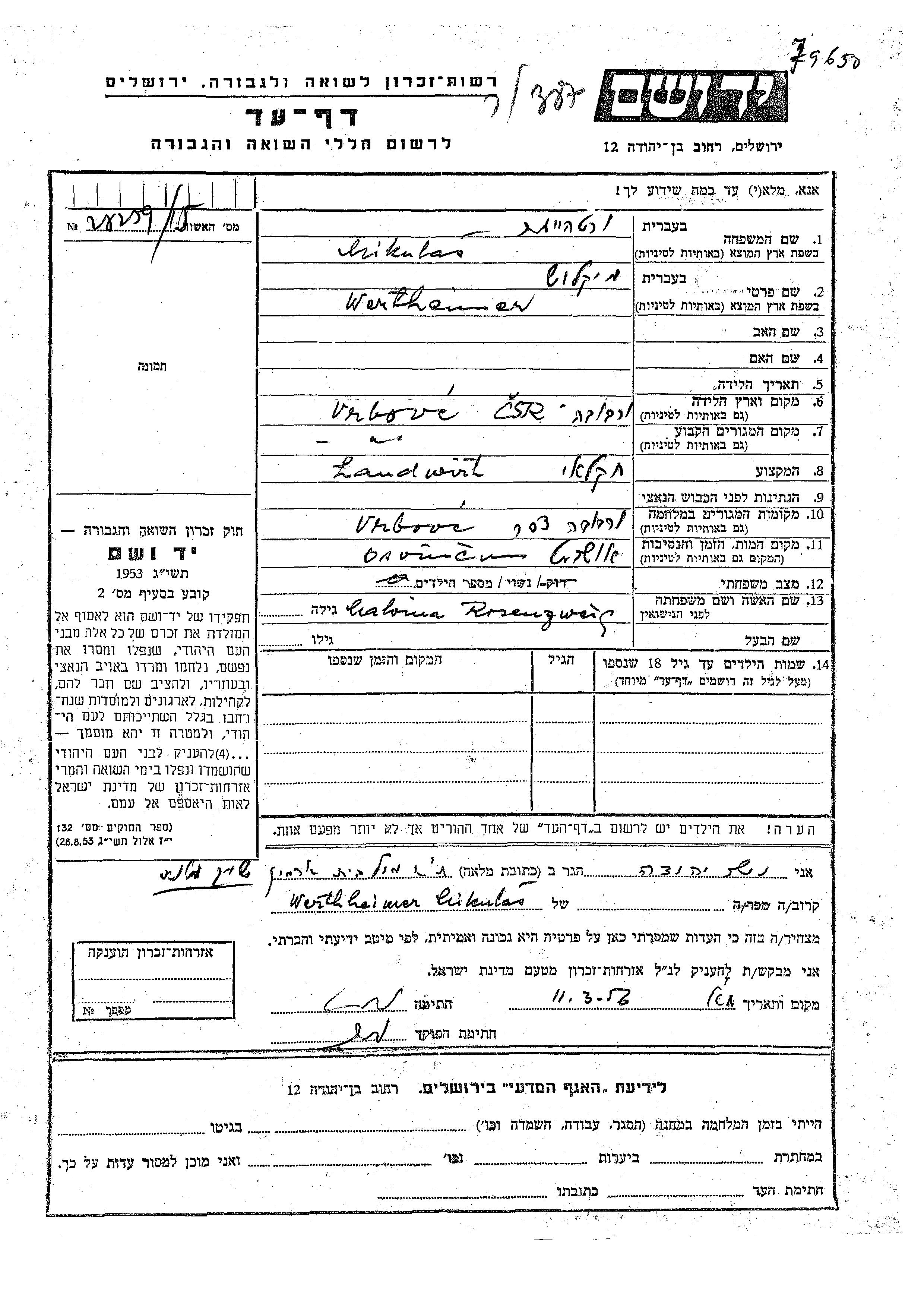 Mikulas Wertheimer was born in Verbove, Czechoslovakia. He was an agriculturist and married to Malvina nee Rosenzweig. Prior to WWII he lived in Verbove, Czechoslovakia. During the war he was in Verbove, Czechoslovakia. Mikulas was murdered in the Shoah. Place of death: Auschwitz, Poland.