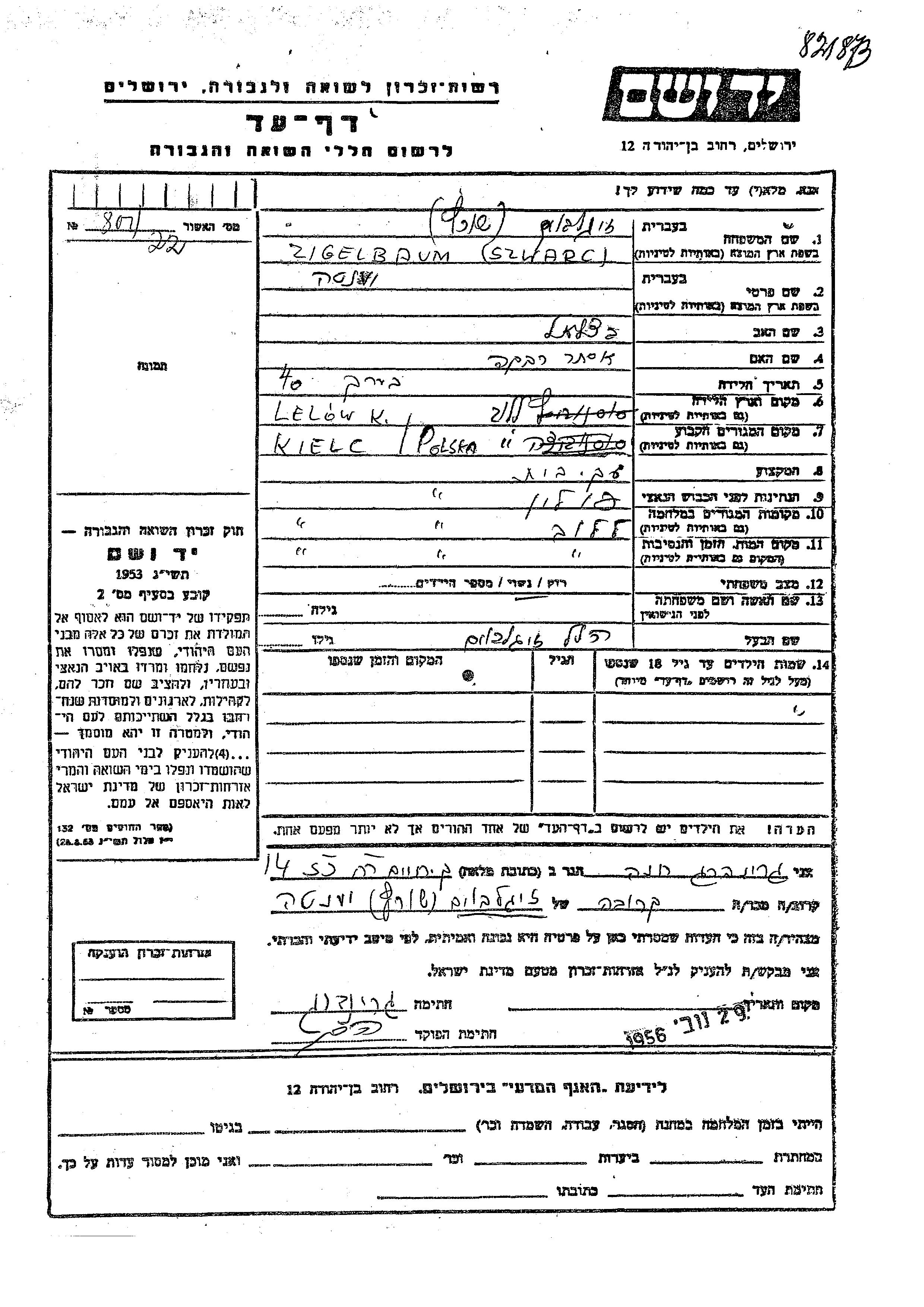 Yenta Zigelboim nee Szwarc was born in Lelow, Poland to Betzalel and Ester Rivka. She was a housewife and married to Hilel. Prior to WWII she lived in Kielce, Poland. During the war she was in Lelow, Poland. Yenta was murdered in the Shoah. Place of death: Lelow, Poland.