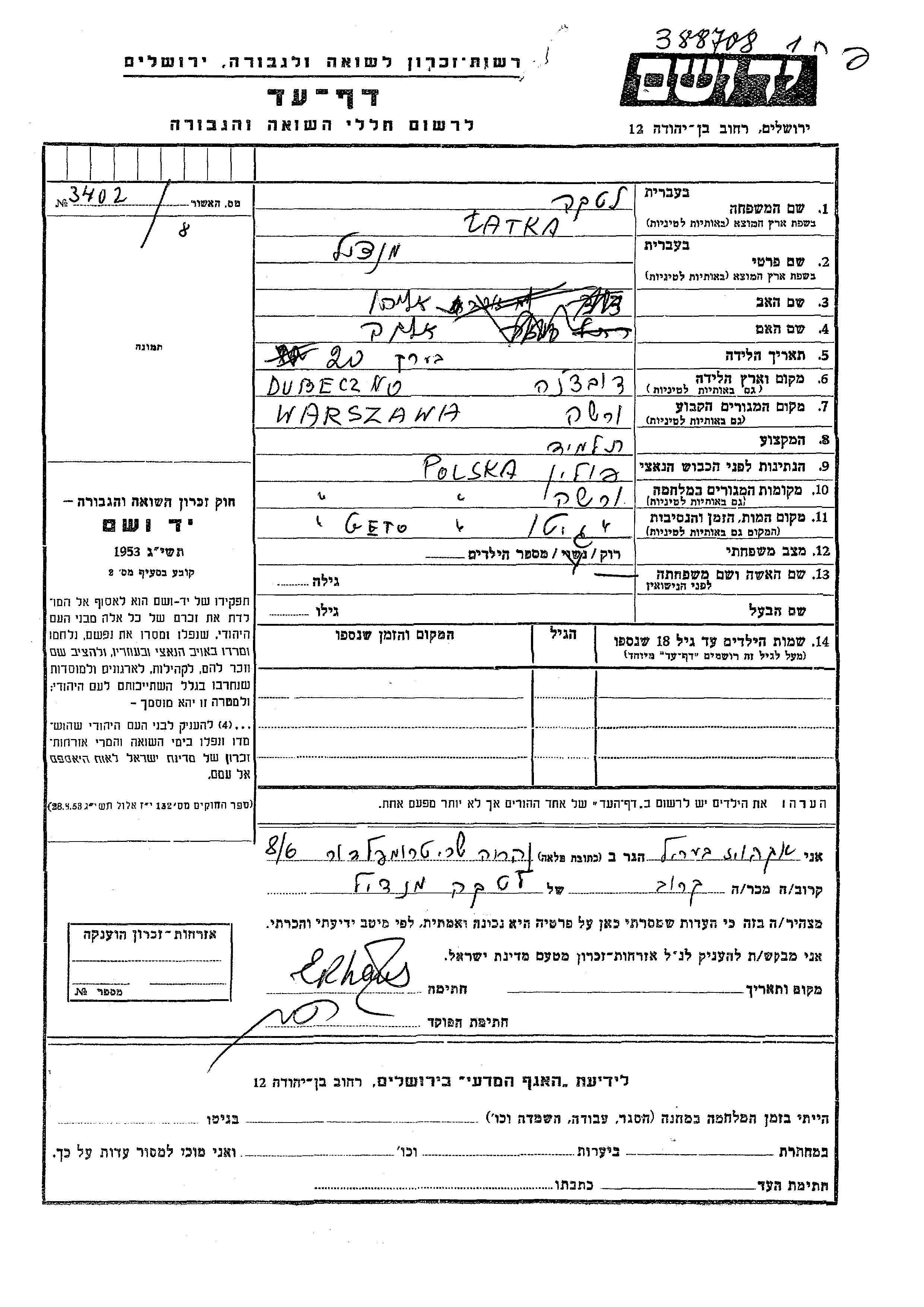 Mendil Latka was born in Dubeczno, Poland to Eliahu and Elka. He was a pupil and single. Prior to WWII he lived in Warsaw, Poland. During the war he was in Warsaw, Poland. Mendil was murdered in the Shoah. Place of death: Warsaw, Poland.