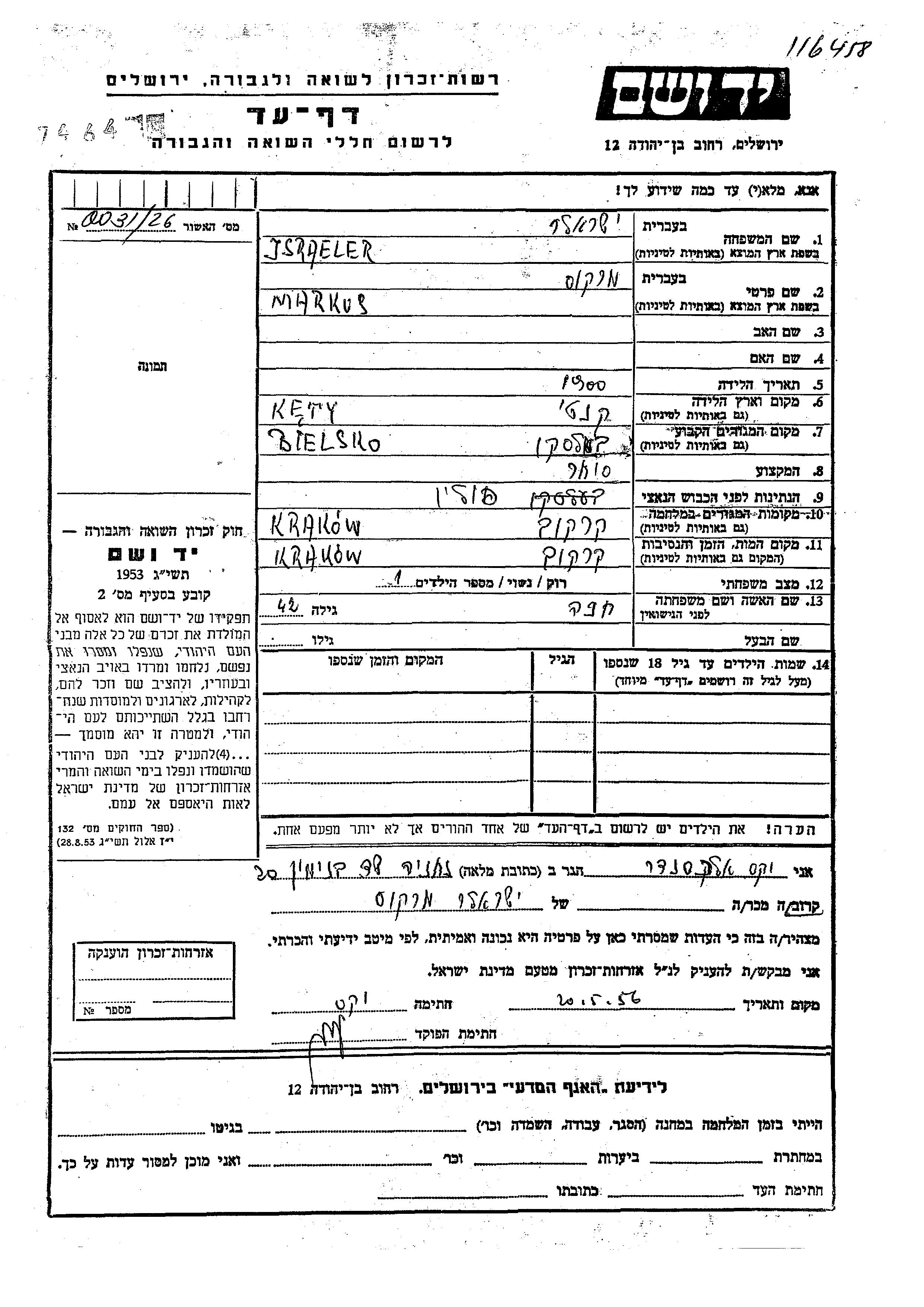 Markus Jsraeler was born in Kety, Poland, 1900. He was a merchant and married to Khana. Prior to WWII he lived in Bielsko, Poland. During the war he was in Krakow, Poland. Markus was murdered in the Shoah. Place of death: Krakow, Poland.