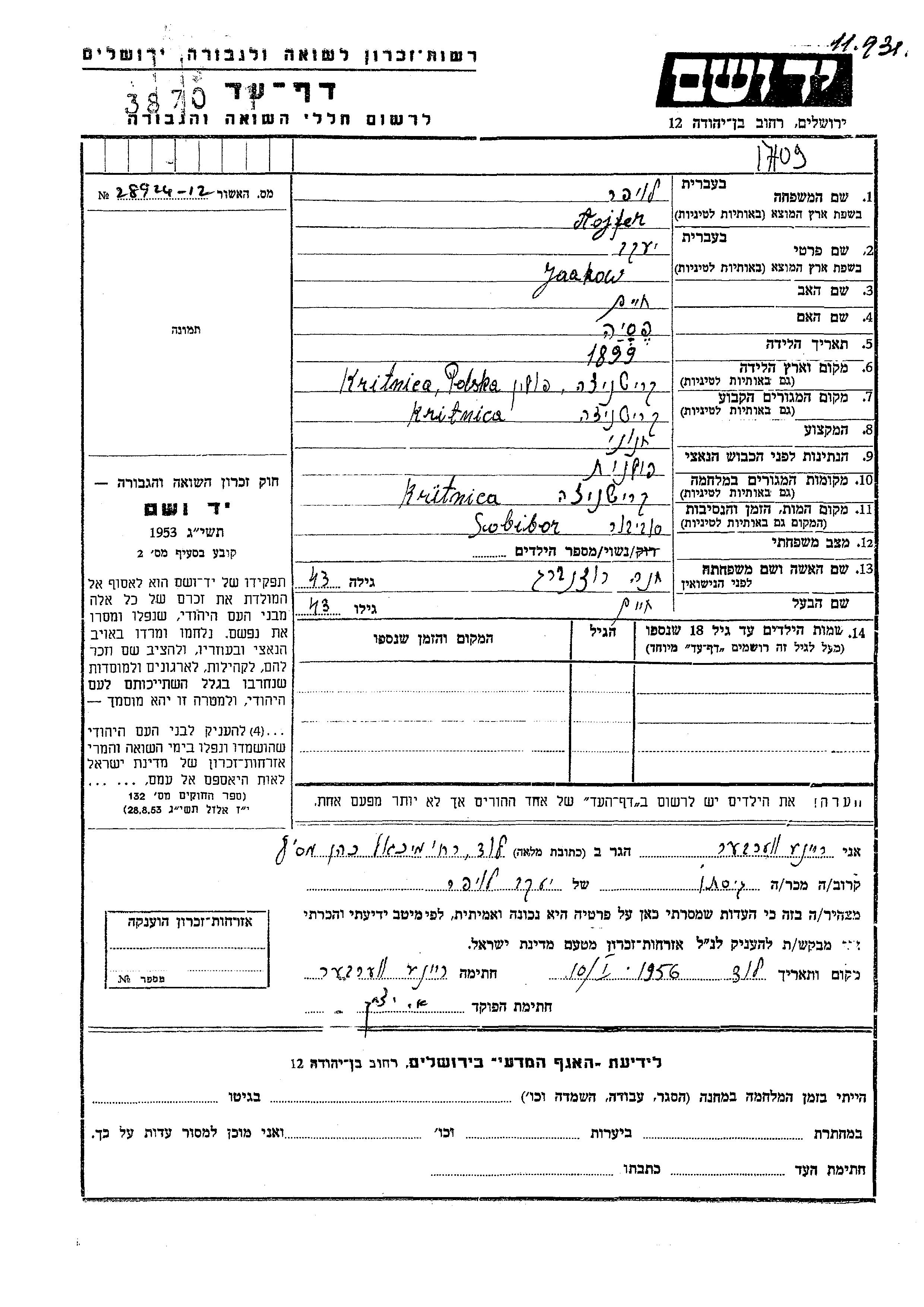 Jaakow Lojfer was born in Kritnica, Poland, 1899 to Khaim and Pesia. He was a grocer. Prior to WWII he lived in Kritnica, Poland. During the war he was in Kritnica, Poland. Jaakow was murdered in the Shoah. Place of death: Sobibor, Poland.