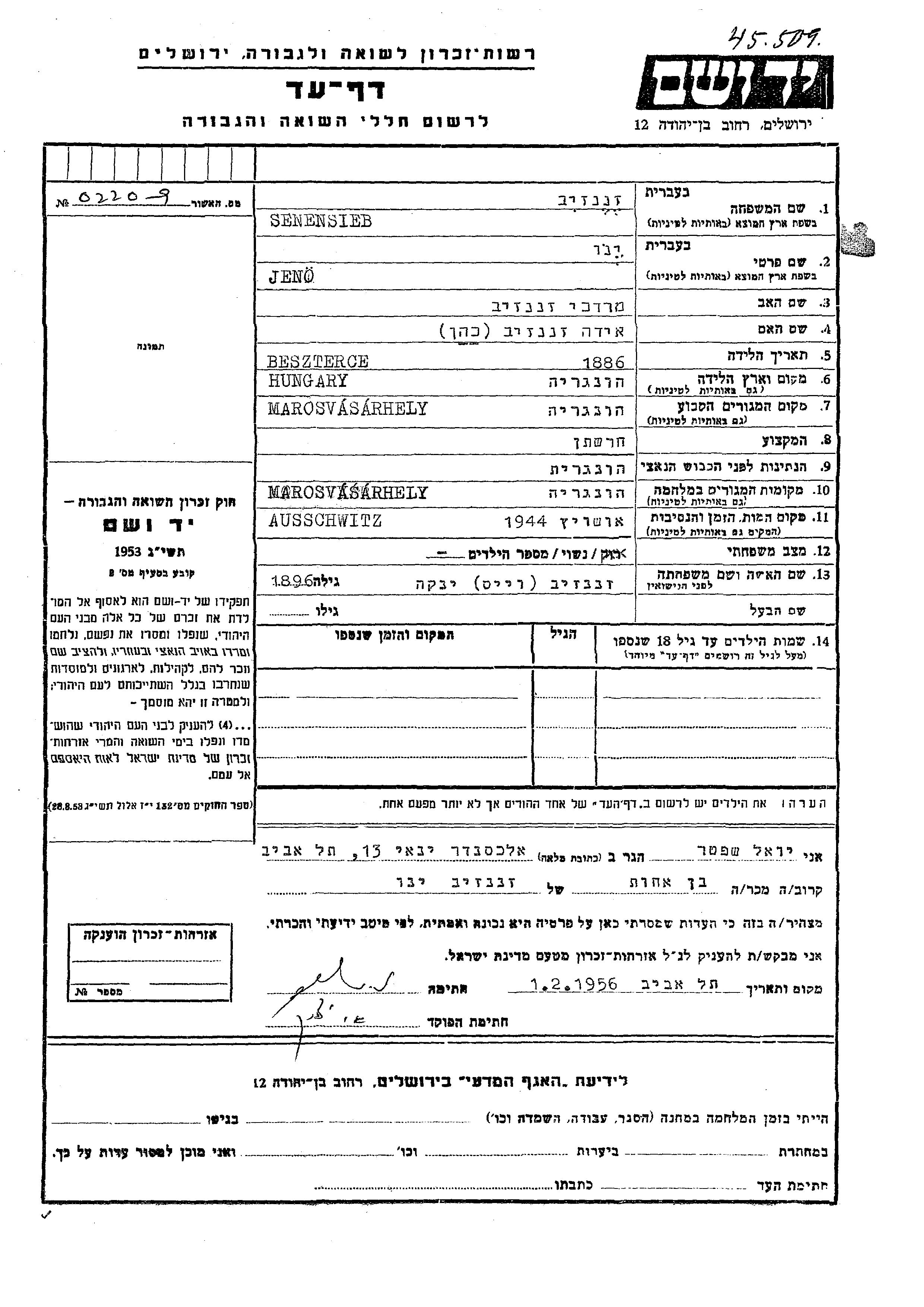 Senensieb Jeno 1886 Marosvasarhely, Romania Page of Testimony