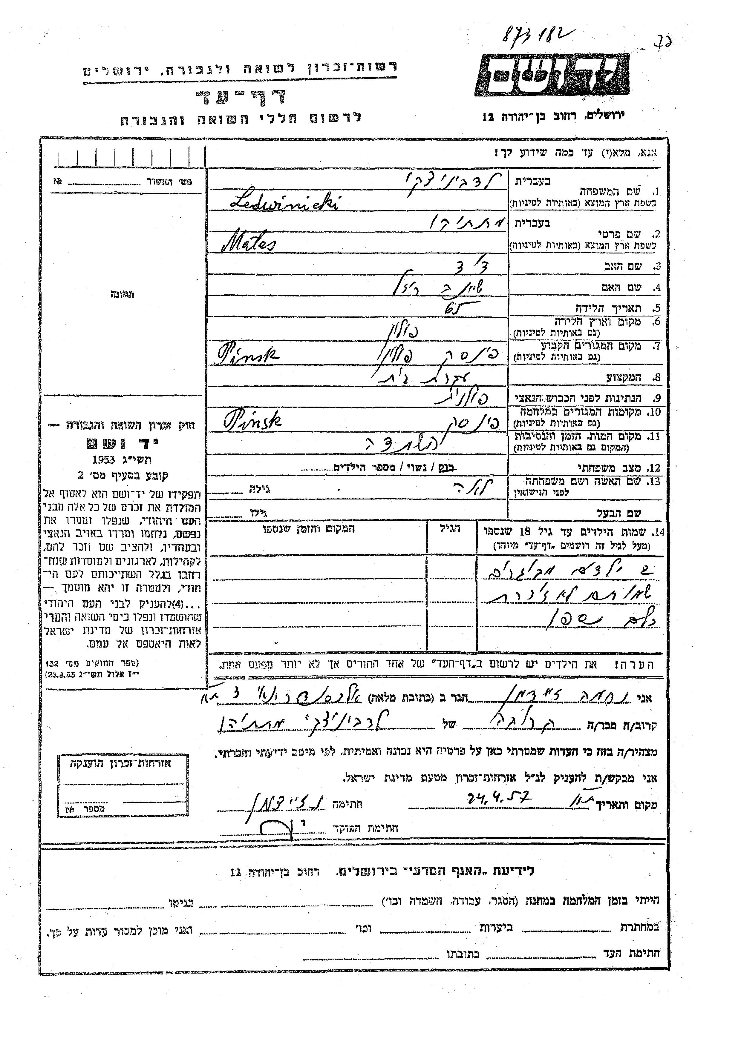Mates Matatiahu Ledwinicki was born in Poland to David and Sheina Reizel. He was married to Lea. Prior to WWII he lived in Pinsk, Poland. During the war he was in Pinsk, Poland. Mates Matatiahu was murdered in the Shoah.