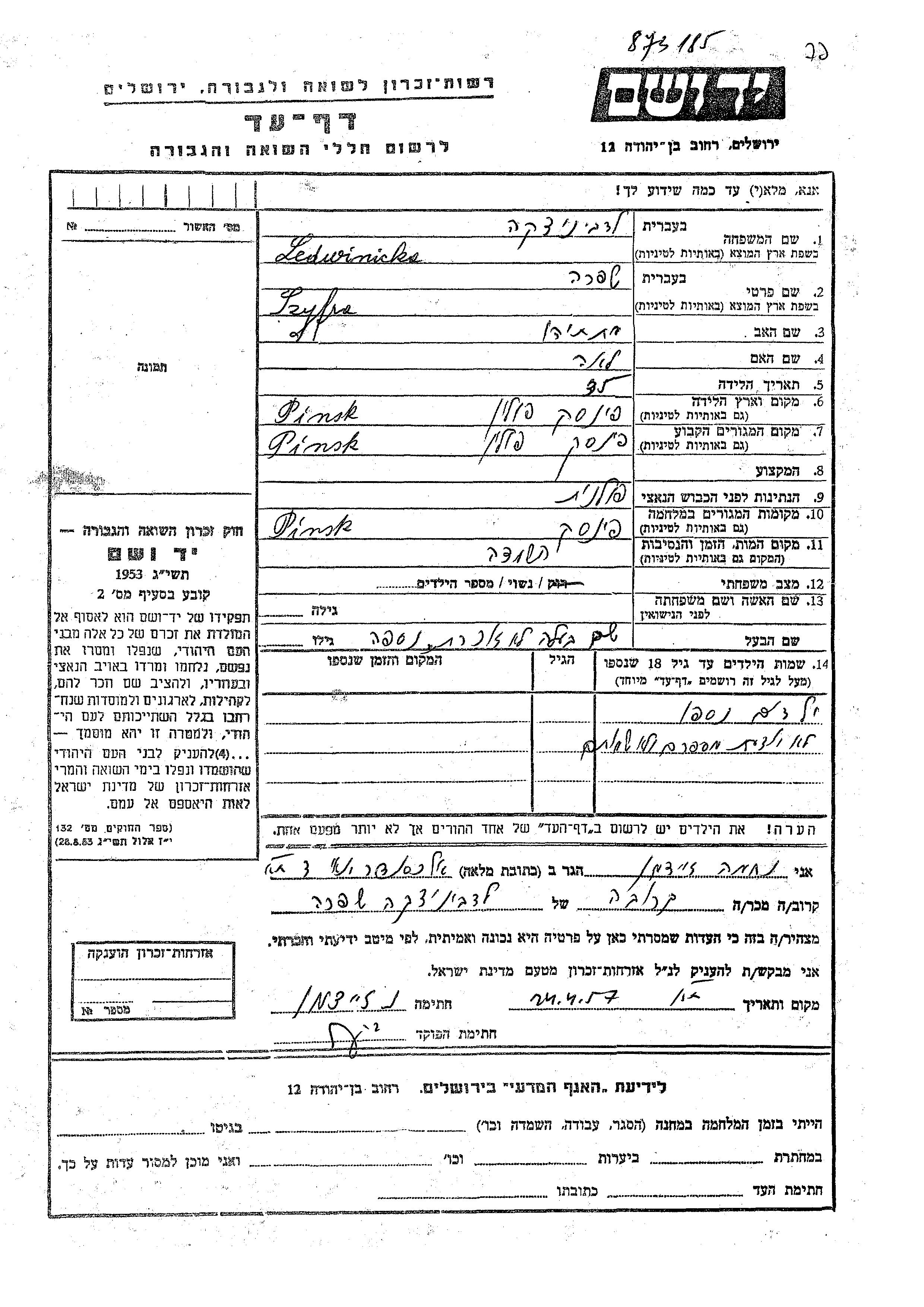 Szyfra Ledwinicka was born in Pinsk, Poland to Matatiahu and Lea. She was a widow. Prior to WWII she lived in Pinsk, Poland. During the war she was in Pinsk, Poland. Szyfra was murdered in the Shoah.