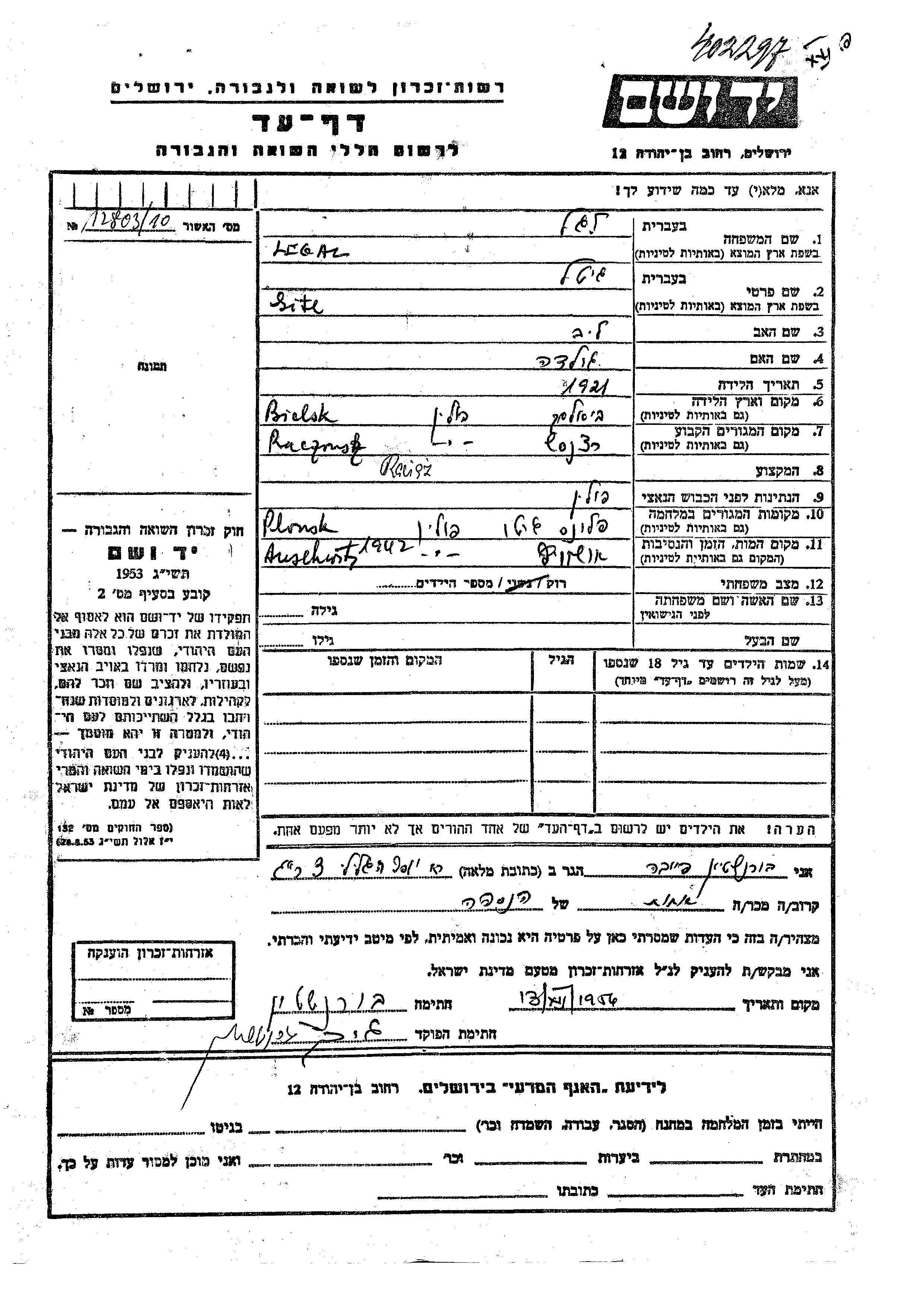 Gitl Legal was born in Bielsk, Poland, 1921 to Leib and Golda. She was single. Prior to WWII she lived in Raciaz, Poland. During the war she was in Plonsk, Poland. Gitl was murdered in the Shoah. Place of death: Auschwitz, Poland, 1942.