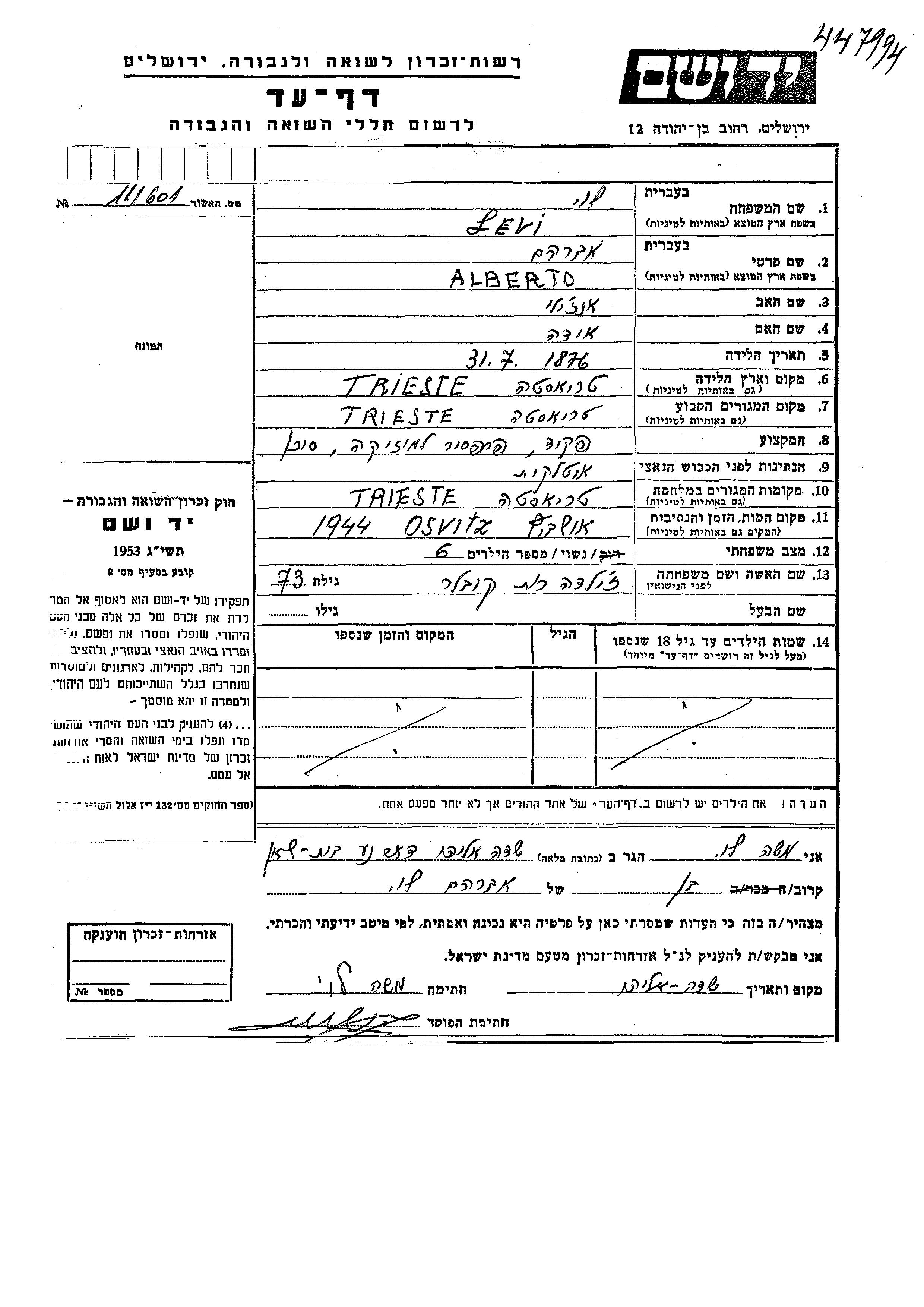 Prof. Alberto Avraham Levi was born in Trieste, Italy, 1876 to Anzhili and Ida. He was a music professor and married to Zilda Rut nee Kovler. Prior to WWII he lived in Trieste, Italy. During the war he was in Trieste, Italy. Prof. Levi was murdered in the Shoah. Place of death: Auschwitz, Poland, 1944.