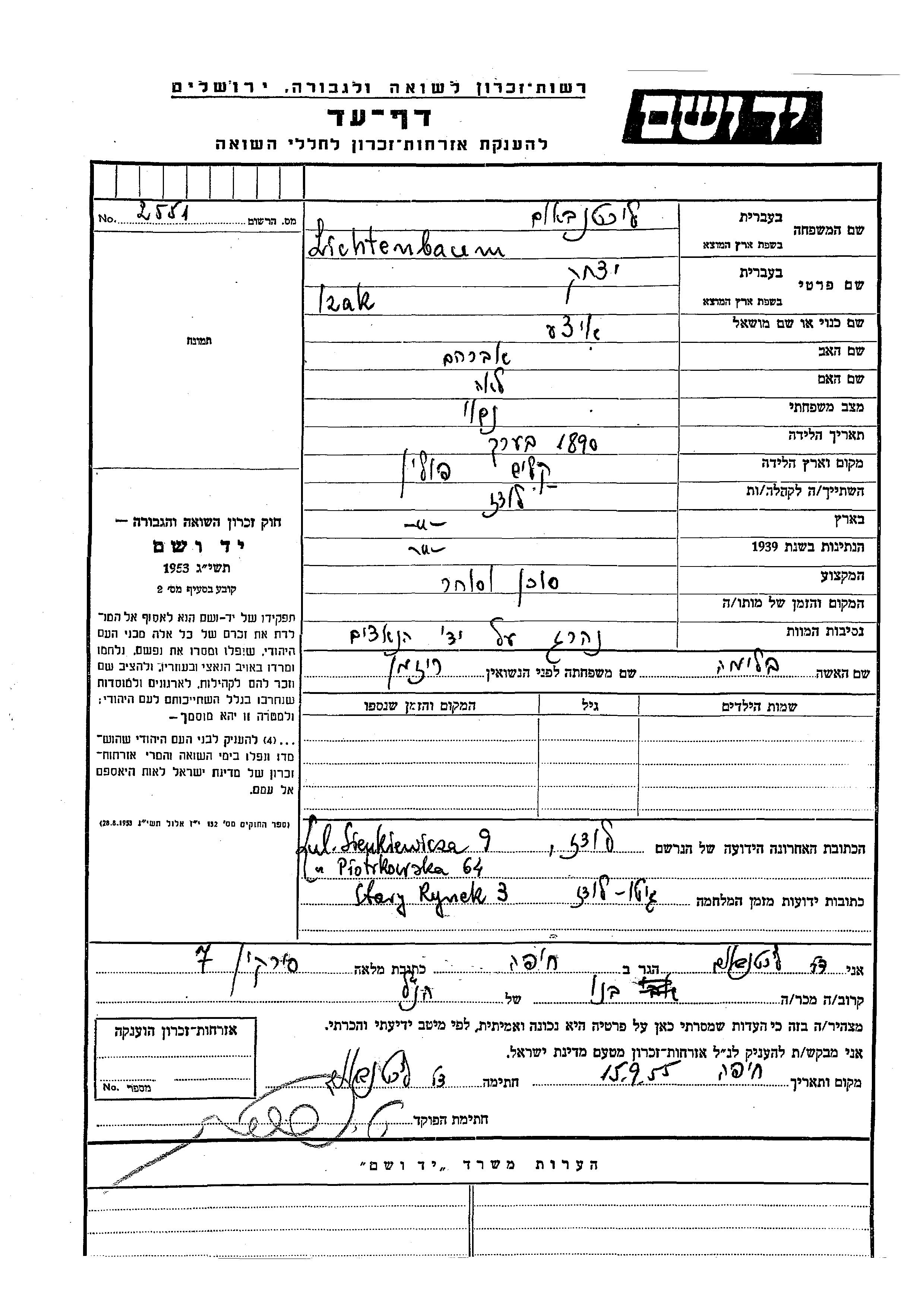 Lichtenbaum Izak 1890 Lodz, Poland Page of Testimony
