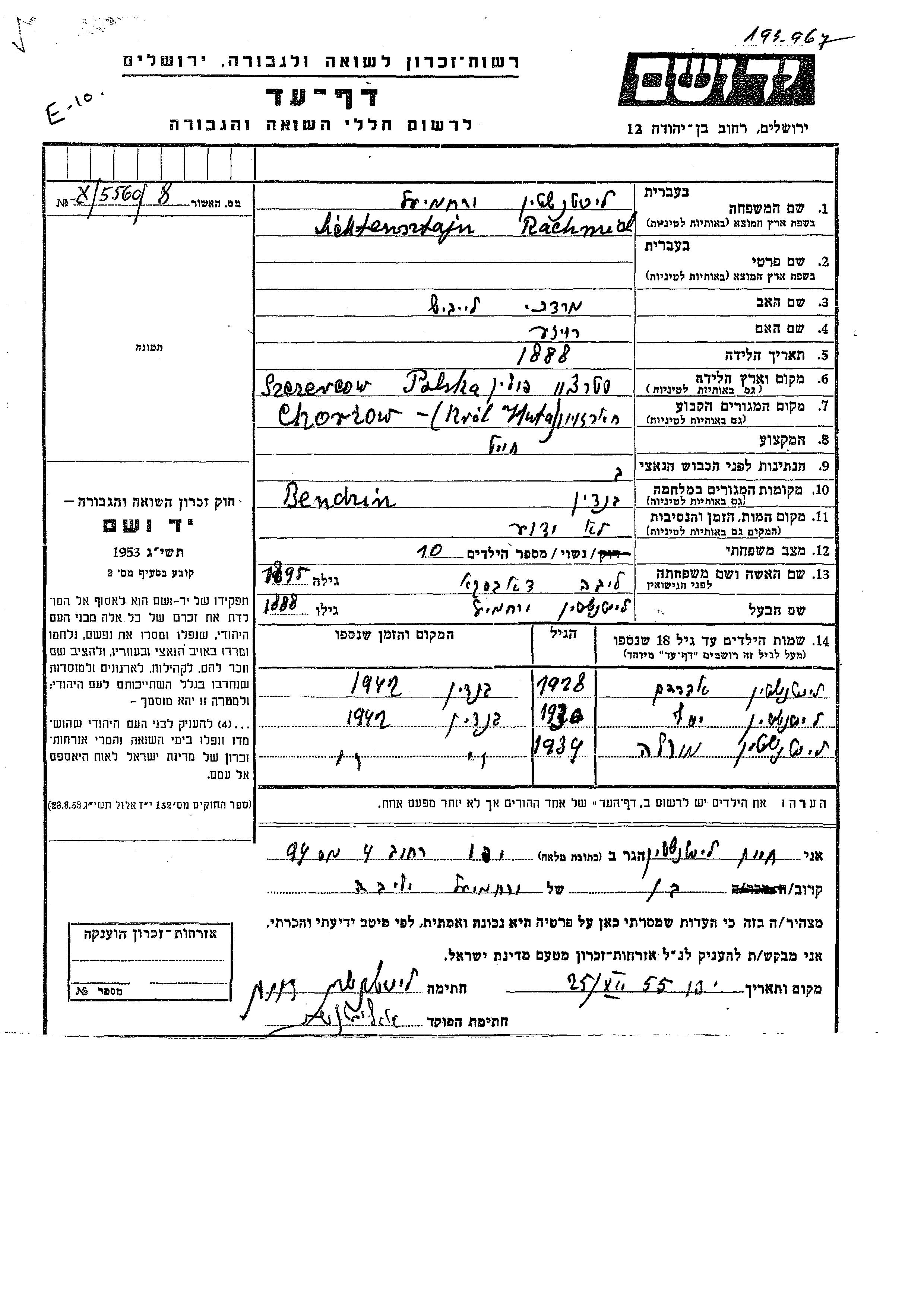 Rachmiel Lichtensztain was born in Szczercow, Poland, 1888 to Mordekhai Leibish and Roze. He was a tailor and married to Liba nee Dubski. Prior to WWII he lived in Chorzów, Poland. During the war he was in Bendzin, Poland. Rachmiel was murdered in the Shoah.