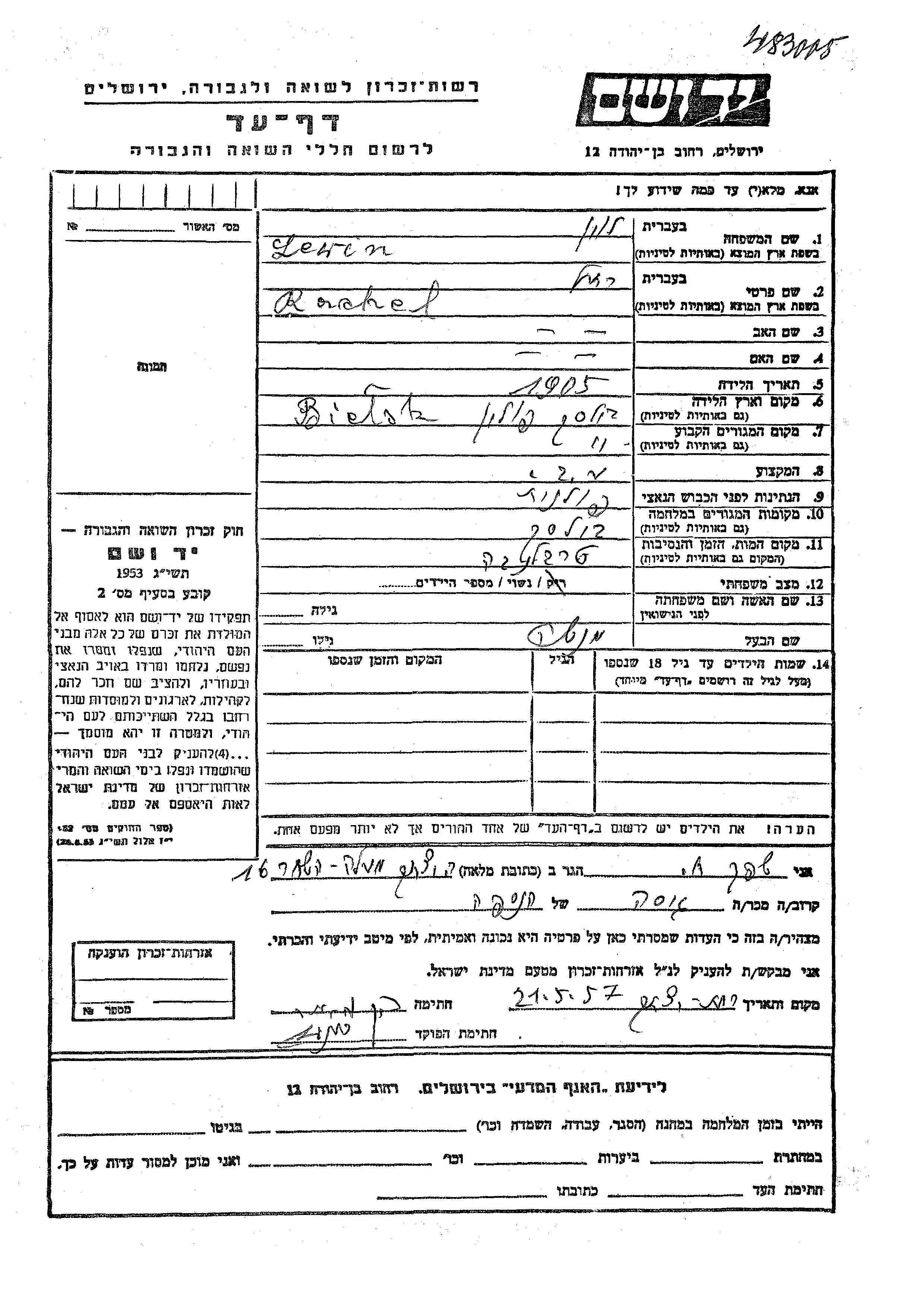 Rachel Lewin was born in Bielsk, Poland, 1905. She was a housewife and married to Menashe. Prior to WWII she lived in Bielsk, Poland. During the war she was in Bielsk, Poland. Rachel was murdered in the Shoah. Place of death: Treblinka, Poland.