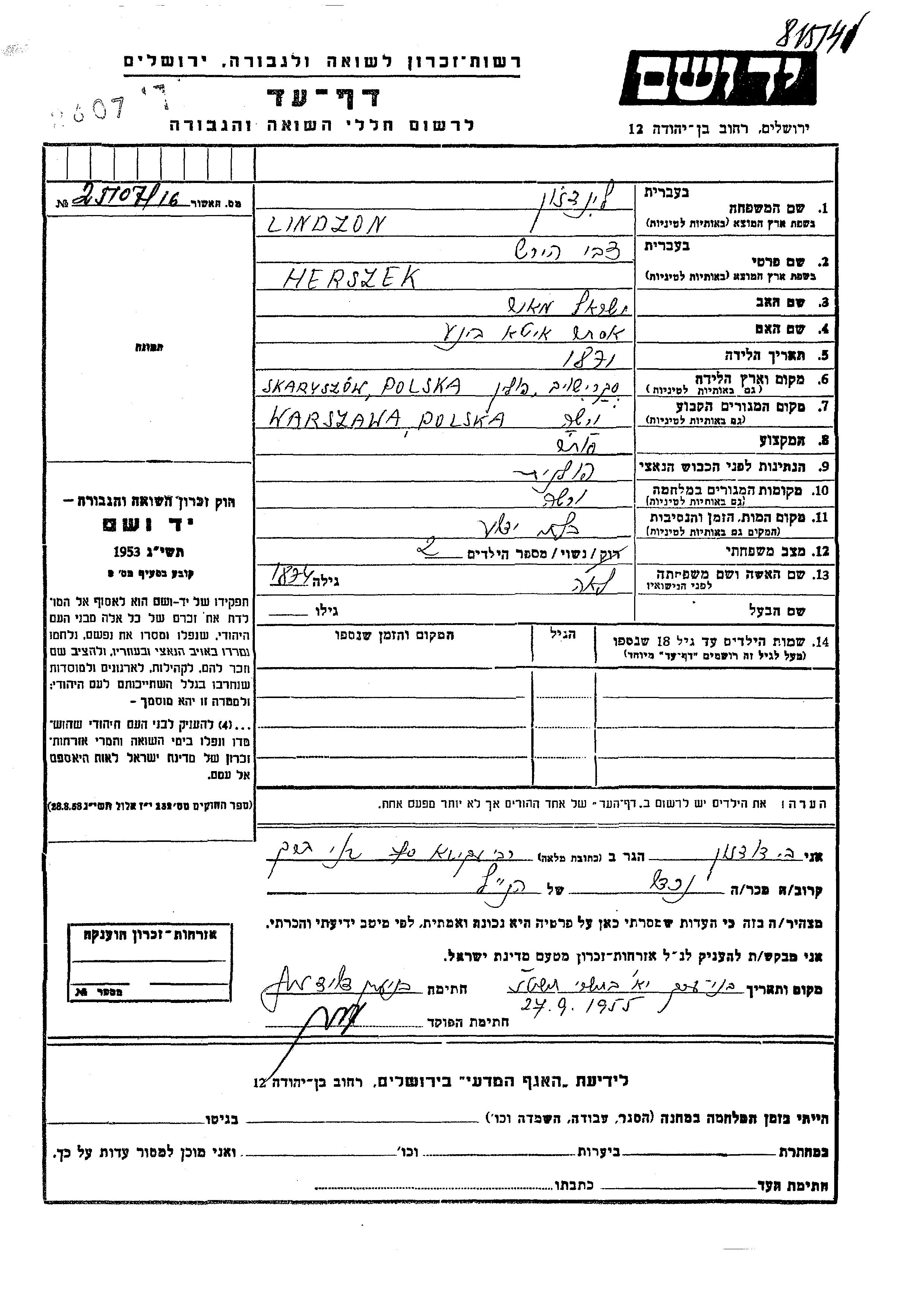 Herszek Tzvi Lindzon was born in Skaryszew, Poland, 1871 to Yisrael Meir and Ester Ita. He was a merchant and married to Lea. Prior to WWII he lived in Warszawa, Poland. During the war he was in Warszawa, Poland. Herszek Tzvi was murdered in the Shoah.